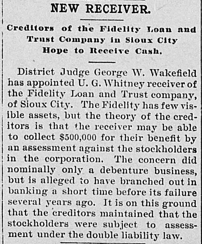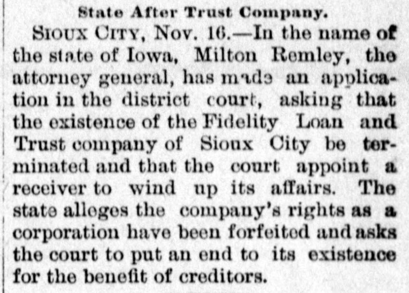 State After Trust Company. SIOUX CITY, Nov. 16.-In the name of the state of Iowa, Milton Remley, the attorney general, has made an application in the district court, asking that the existence of the Fidelity Loan and Trust company of Sioux City be terminated and that the court appoint a receiver to wind up its affairs. The state alleges the company's rights as a corporation have been forfeited and asks the court to put an end to its existence for the benefit of creditors.