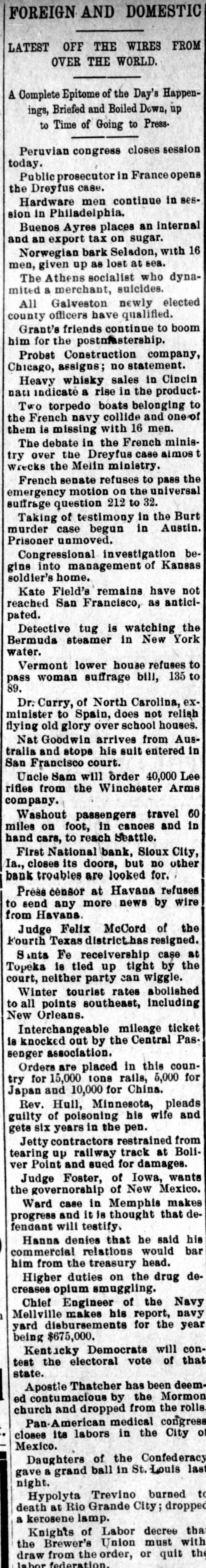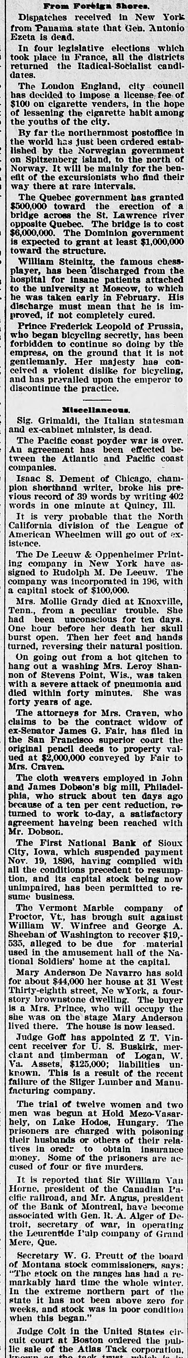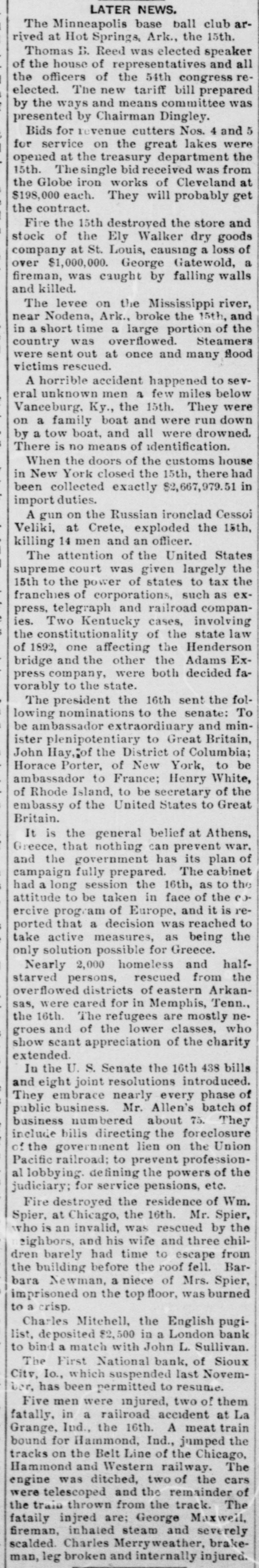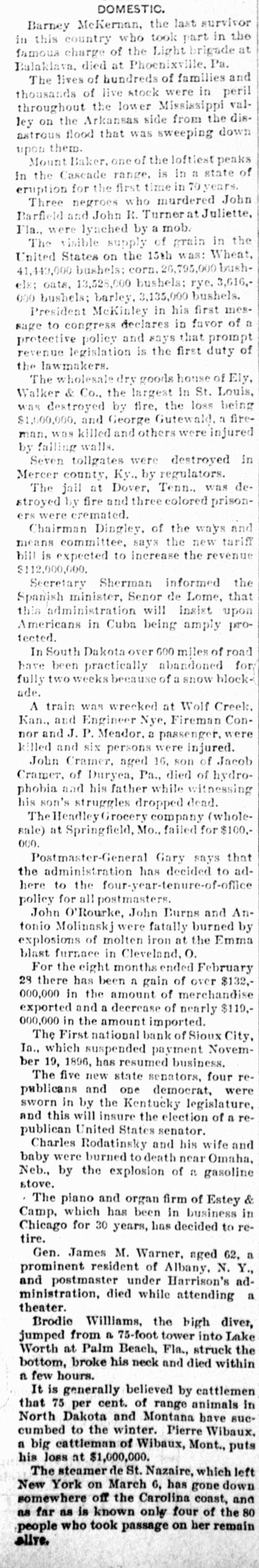 DOMESTIC. Barney McKernan, the last survivor 11 this country who took part in the amous charge of the Light brigade at Balaklava, died at Phoenixville, Pa. The lives of hundreds of families and housands of live stock were in peril hroughout the lower Mississippi valey on the Arkansas side from the disistrous flood that was sweeping down pon them. Mount Baker, one of the loftlest peaks n the Cascade range, is in a state of eruption for the first time in years. Three negroes who murdered John Barfield and John R. Turner at Juliette, la., were lynched by a mob. The visible supply of grain in the Inited States on the 15th was: Wheat, 1,449,000 bushels: corn. 26,795,000 bushIs; oats, 13,528,000 bushels: rye, 3,616,00 bushels; barley, 3,135,000 bushels. President McKinley in his first mesage to congress declares in favor of a protective policy and says that prompt revenue legislation is the first duty of he lawmakers. The wholesale dry goods house of Ely, Walker & Co., the largest in St. Louis, was destroyed by fire, the loss being $1,000,000. and George Gutewald, a fireman. was killed and others were injured by falling walls. Seven tollgates were destroyed in Mercer county, Ky., by regulators. The jail at Dover. Tenn., was detroyed by fire and three colored prisoners were cremated. Chairman Dingley, of the ways and neans committee, says the new tariff ill is expected to increase the revenue Secretary Sherman informed the Spanish minister, Senor de Lome, that this administration will insist upon Americans in Cuba being amply proected. In South Dakota over 600 miles of road have been practically abandoned for: fully two weeks because of a snow blockapr A train was wrecked at Wolf Creek, Kan., and Engineer Nye, Fireman Connor and J. P. Meador. a passenger, were killed and six persons were injured. John Cramer, aged 16, son of Jacob Cramer, of Duryea, Pa., died of hydroohobia and his father while witnessing his son's struggles dropped dead. The Headley Grocery company (wholesale) at Springfield, Mo., failed for $100.*000 Postmaster-General Gary says that the administration has decided to adhere to the four-year-tenure-of-oflice policy for all postmasters. John O'Rourke, John Burns and Antonio Molinaskj were fatally burned by explosions of molten iron at the Emma blast furnace in Cleveland, O. For the eight months ended February 28 there has been a gain of over $132,000,000 in the amount of merchandise exported and a decrease of nearly $110,000,000 in the amount imported. The First national bank of Sioux City, Ia., which suspended payment November 19, 1896, has resumed business. The five new state senators, four republicans and one democrat, were sworn in by the Kentucky legislature, and this will insure the election of a republican United States senator. Charles Rodatinsky and his wife and baby were burned to death near Omaha, Neb., by the explosion of a gasoline stove. . The piano and organ firm of Estey & Camp, which has been in business in Chicago for 30 years, has decided to retire. Gen. James M. Warner, aged 62, a prominent resident of Albany, N. Y., and postmaster under Harrison's administration, died while attending a theater. Brodie Williams, the bigh diver, jumped from a 75-foot tower into Lake Worth at Palm Beach, Fla., struck the bottom, broke his neck and died within n. few hours. It is generally believed by cattlemen that 75 per cent. of range animals in North Dakota and Montana have sucPierre winter. the to