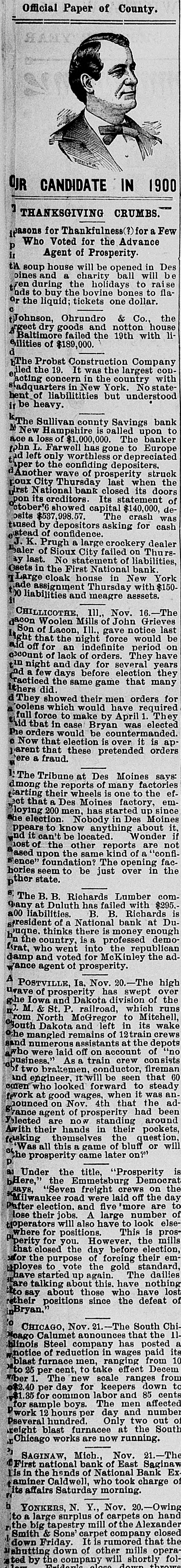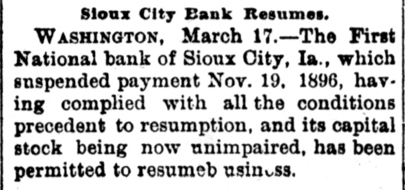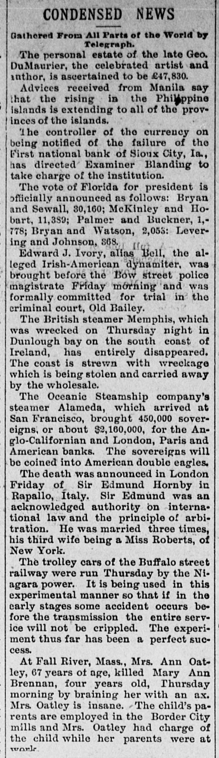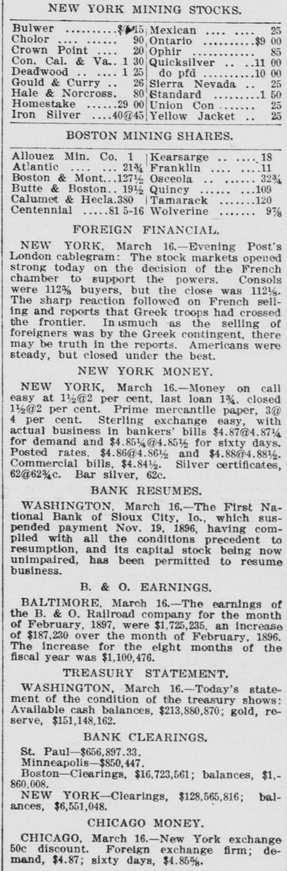 DOMESTIC. Barney McKernan, the last survivor 11 this country who took part in the amous charge of the Light brigade at Balaklava, died at Phoenixville, Pa. The lives of hundreds of families and housands of live stock were in peril hroughout the lower Mississippi valey on the Arkansas side from the disistrous flood that was sweeping down pon them. Mount Baker, one of the loftlest peaks n the Cascade range, is in a state of eruption for the first time in years. Three negroes who murdered John Barfield and John R. Turner at Juliette, la., were lynched by a mob. The visible supply of grain in the Inited States on the 15th was: Wheat, 1,449,000 bushels: corn. 26,795,000 bushIs; oats, 13,528,000 bushels: rye, 3,616,00 bushels; barley, 3,135,000 bushels. President McKinley in his first mesage to congress declares in favor of a protective policy and says that prompt revenue legislation is the first duty of he lawmakers. The wholesale dry goods house of Ely, Walker & Co., the largest in St. Louis, was destroyed by fire, the loss being $1,000,000. and George Gutewald, a fireman. was killed and others were injured by falling walls. Seven tollgates were destroyed in Mercer county, Ky., by regulators. The jail at Dover. Tenn., was detroyed by fire and three colored prisoners were cremated. Chairman Dingley, of the ways and neans committee, says the new tariff ill is expected to increase the revenue Secretary Sherman informed the Spanish minister, Senor de Lome, that this administration will insist upon Americans in Cuba being amply proected. In South Dakota over 600 miles of road have been practically abandoned for: fully two weeks because of a snow blockapr A train was wrecked at Wolf Creek, Kan., and Engineer Nye, Fireman Connor and J. P. Meador. a passenger, were killed and six persons were injured. John Cramer, aged 16, son of Jacob Cramer, of Duryea, Pa., died of hydroohobia and his father while witnessing his son's struggles dropped dead. The Headley Grocery company (wholesale) at Springfield, Mo., failed for $100.*000 Postmaster-General Gary says that the administration has decided to adhere to the four-year-tenure-of-oflice policy for all postmasters. John O'Rourke, John Burns and Antonio Molinaskj were fatally burned by explosions of molten iron at the Emma blast furnace in Cleveland, O. For the eight months ended February 28 there has been a gain of over $132,000,000 in the amount of merchandise exported and a decrease of nearly $110,000,000 in the amount imported. The First national bank of Sioux City, Ia., which suspended payment November 19, 1896, has resumed business. The five new state senators, four republicans and one democrat, were sworn in by the Kentucky legislature, and this will insure the election of a republican United States senator. Charles Rodatinsky and his wife and baby were burned to death near Omaha, Neb., by the explosion of a gasoline stove. . The piano and organ firm of Estey & Camp, which has been in business in Chicago for 30 years, has decided to retire. Gen. James M. Warner, aged 62, a prominent resident of Albany, N. Y., and postmaster under Harrison's administration, died while attending a theater. Brodie Williams, the bigh diver, jumped from a 75-foot tower into Lake Worth at Palm Beach, Fla., struck the bottom, broke his neck and died within n. few hours. It is generally believed by cattlemen that 75 per cent. of range animals in North Dakota and Montana have sucPierre winter. the to