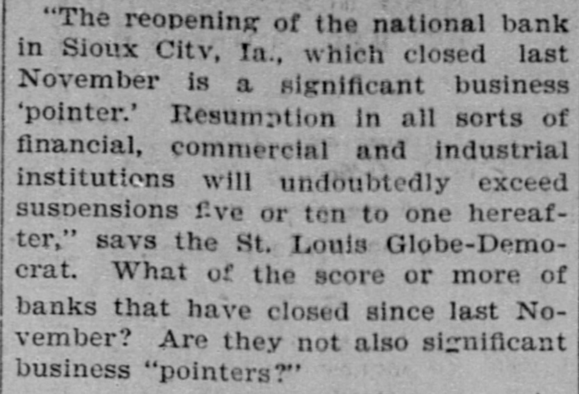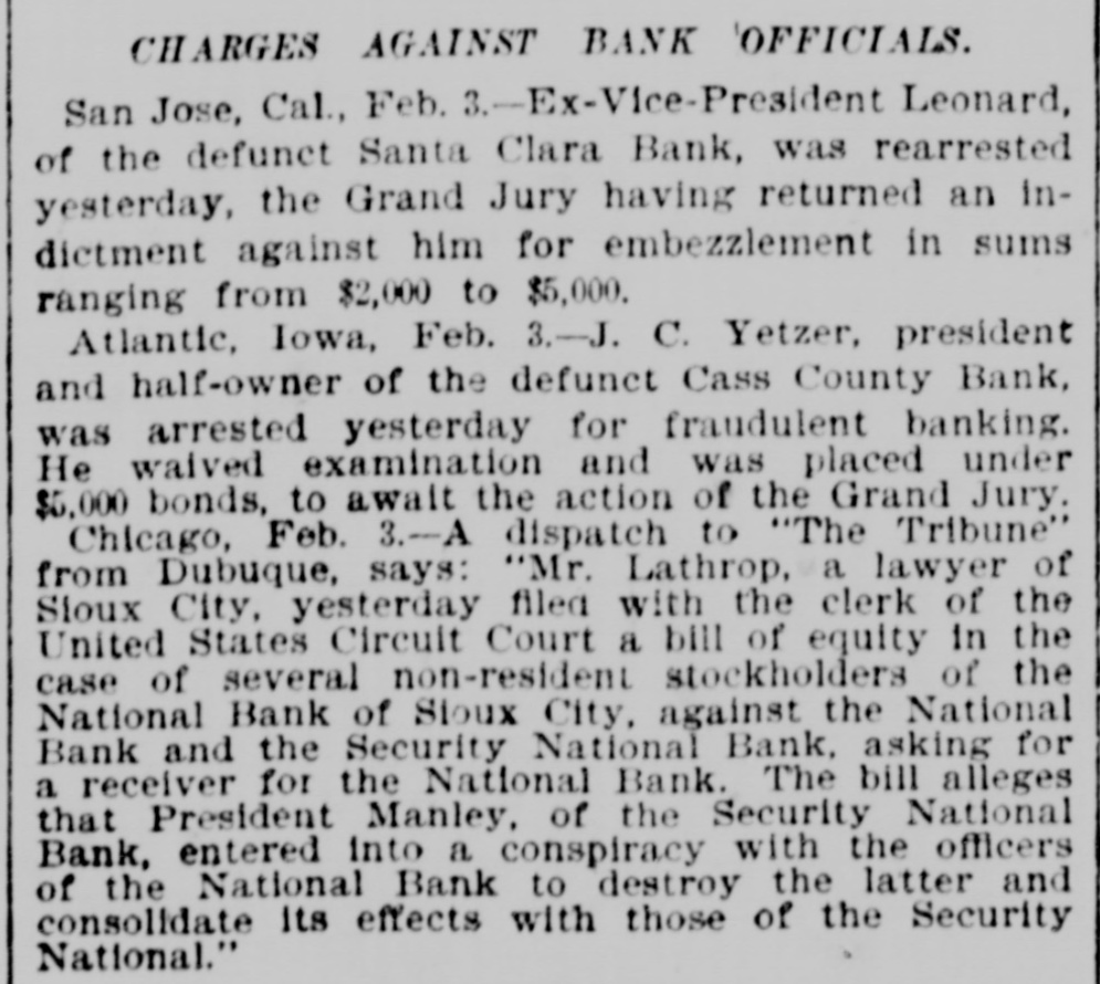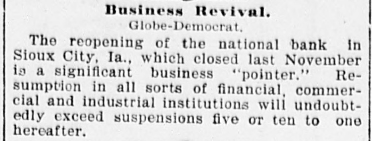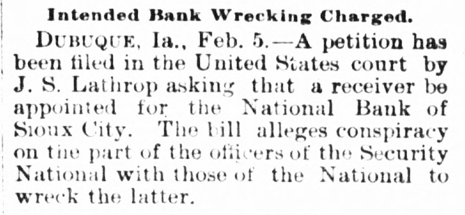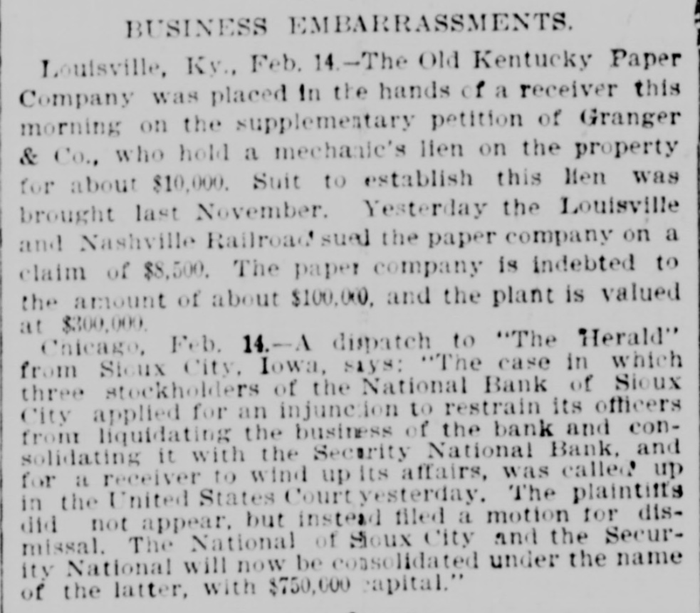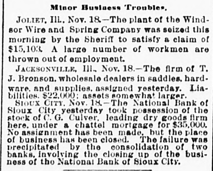 Minor Business Troubles, JOLIET, Ill. Nov. 18.-The plant of the Windsor Wire and Spring Company was seized this morning by the Sheriff to satisfy a claim of $15,103. A large number of workmen are thrown out of employment. JACKSONVILLE, III., Nov. 18.-The firm of T. J. Bronson. wholesale dealers in saddles. hardware. and supplies. assigned yesterday. Liabilities. $22,000: assets somewhat larger. SIOUX CITY. Nov. 18.-The National Bank of Sioux City yesterday took possession of the stock of C. G. Culver, leading dry goods firm here. under a chattel mortgage for $35,000. No assignment has been made. but the place of business has been closed. The failure was precipitated by the consolidation of two banks. involving the closing up of the business of the National Bank of Sioux City.