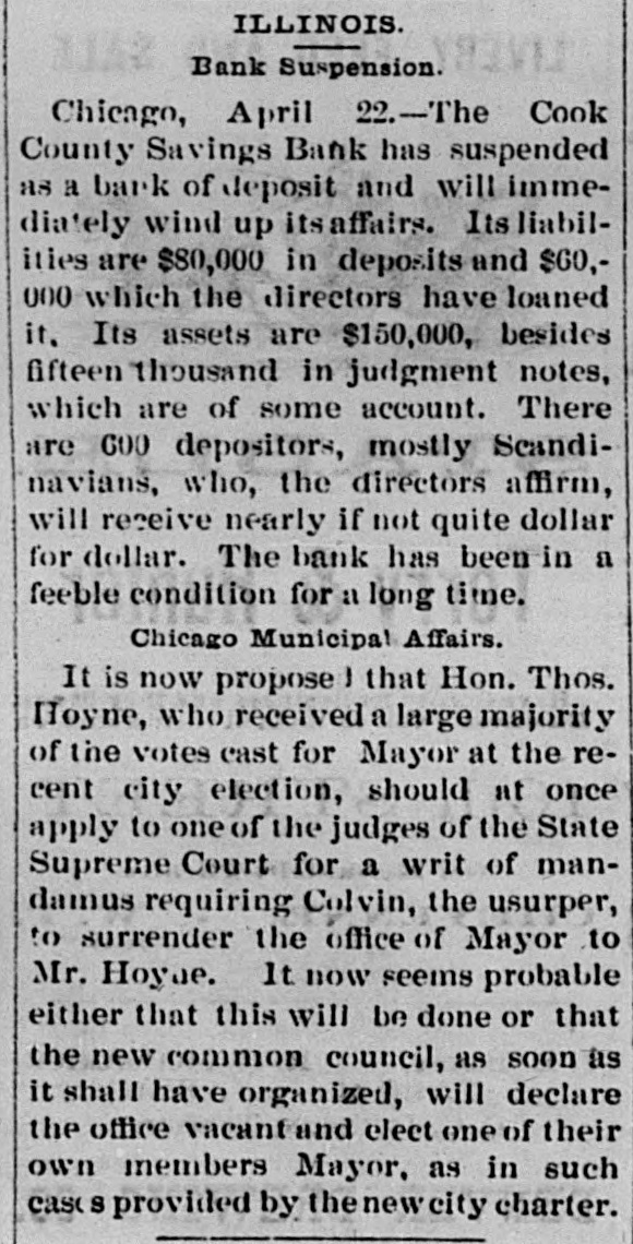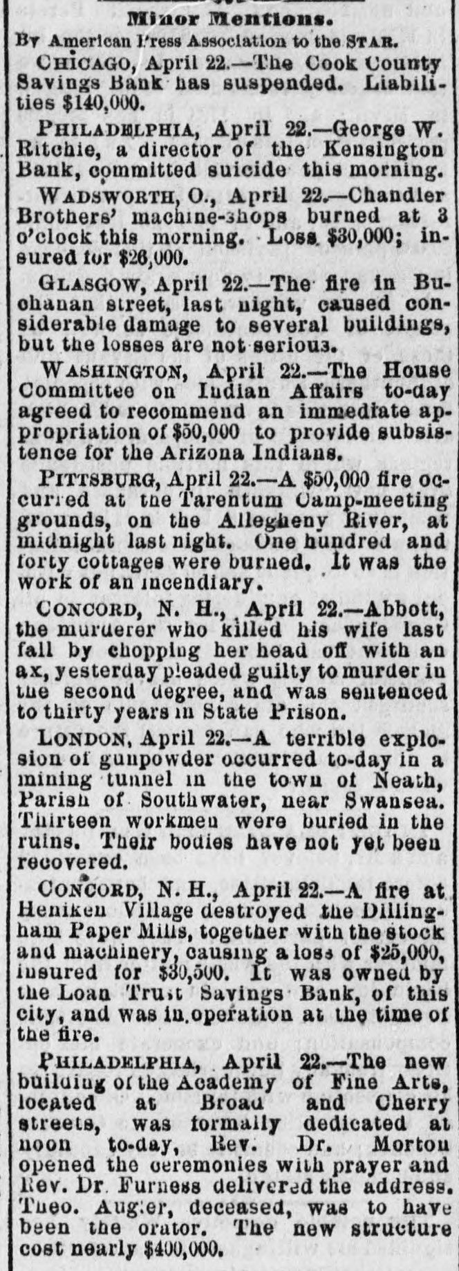 Minor Mentions. By American Press Association to the STAR. CHICAGO, April 22.-The Cook County Savings Bank has suspended. Liabilities $140,000. PHILADELPHIA, April 22.-George W. Ritchie, a director of the Kensington Bank, committed suicide this morning. WADSWORTH, O., April 22.-Chandler Brothers' machine-shops burned at 3 o'clock this morning. Loss $30,000; insured for $26,000. GLASGOW, April 22.-The fire in Buohanan street, last night, caused considerable damage to several buildings, but the losses are not serious. WASHINGTON, April 22.-The House Committee on Indian Affairs to-day agreed to recommend an immediate appropriation of $50,000 to provide subsistence for the Arizona Indians. PITTSBURG, April 22.-A $50,000 fire occurred at the Tarentum Camp-meeting grounds, on the Allegheny River, at midnight last night. One hundred and forty cottages were burned. It was the work of an incendiary. CONCORD, N. H., April 22.-Abbott, the murderer who killed his wife last fall by chopping her head off with an ax, yesterday pleaded guilty to murder in the second degree, and was sentenced to thirty years in State Prison. LONDON, April 22.-A terrible explosion of gunpowder occurred to-day in a mining tunnel in the town of Neath, Parish of Southwater, near Swansea. Thirteen workmen were buried in the ruins. Their bodies have not yet been recovered. CONCORD, N.H., April 22.-A fire at Heniken Village destroyed the Dillingham Paper Mills, together with the stock and machinery, causing a loss of $25,000, insured for $30,500. It was owned by the Loan Trust Savings Bank, of this city, and was in operation at the time of the fire. PHILADELPHIA, April 22.-The new building or the Academy of Fine Arts, located at Broad and Cherry streets, was formally dedicated at noon to-day, Rev. Dr. Morton opened the ceremonies with prayer and Rev. Dr. Furness delivered the address. Tueo. Augler, deceased, was to have been the orator. The new structure cost nearly $400,000.