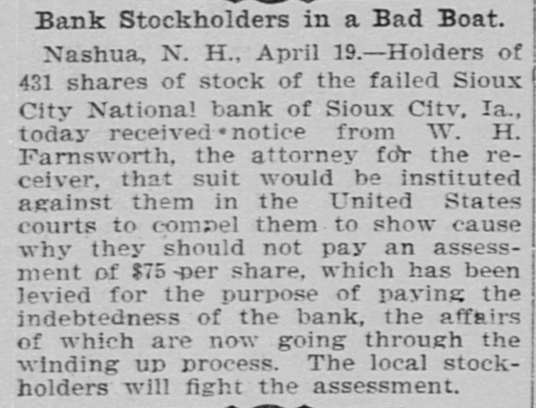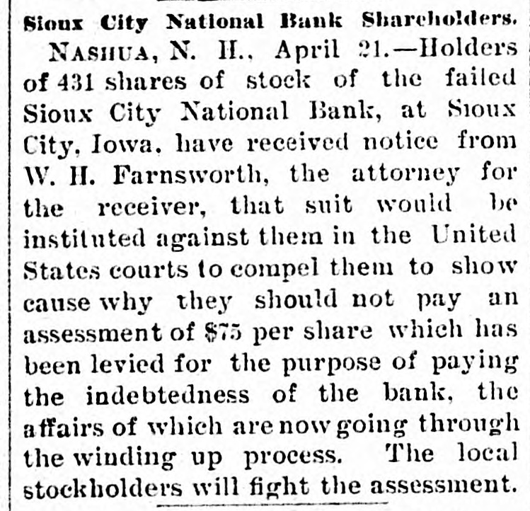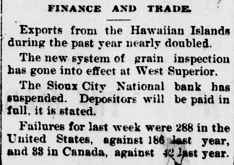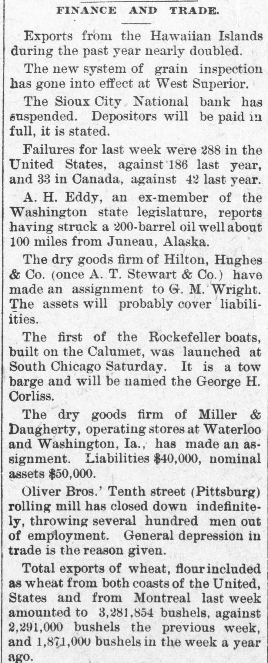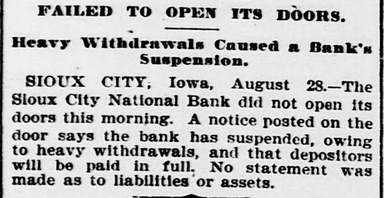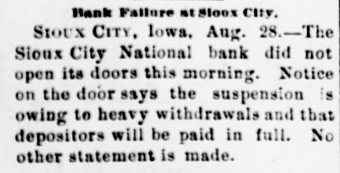 Iron Furnace Reduces Wages. PHILLIPSBURG, N J., Aug. 28, 1896.-A reduction of 10 per cent. in the wages of the employes of the Andover furnace, who receive more than $1.10 a day, will take place on September 1. Superintendent Patterson says the company is unable to compete with other furnaces in the price of iron because of the fact that it cannot get coal at a reasonable figure. The men have concluded that út is better to suffer the reduction than to have the furnace banked. Six Hundred Hosiery Hands Out. NEW BRUNSWICK, N. J., Aug. 28, 1896.-The New Brunswick and Norfolk Hostery Company have announced that, owing to the dull times and stagnation in trade, they will close down their various departments for an indefinite period. Over 600 hands will be thrown out of employment. New Yosk Collapses. NEW YORK, Aug. 28, 1896.-Alter Gottlieb, retail jeweler, alt No. 336 East Houston street, has assigned to Simon Friedman, with preferences for $2,500. The liabilities are estimated at $23,000. Frederick C. and Isaac N. Van Vliet, malsters, No. 402 Produce Exchange Building, have assigned to Lucas L. Van Allen, without preferences. National Bank Succumbs, SIOUX CITY, Iowa, Aug. 28, 1896.Heavy withdrawals of deposits caused the failure of the Sioux City National Bank here this morning. The Bank Examiner has not yet arrived and no accurate estimate of assets and liabilities can be given. They will probably be about $950,000 each.