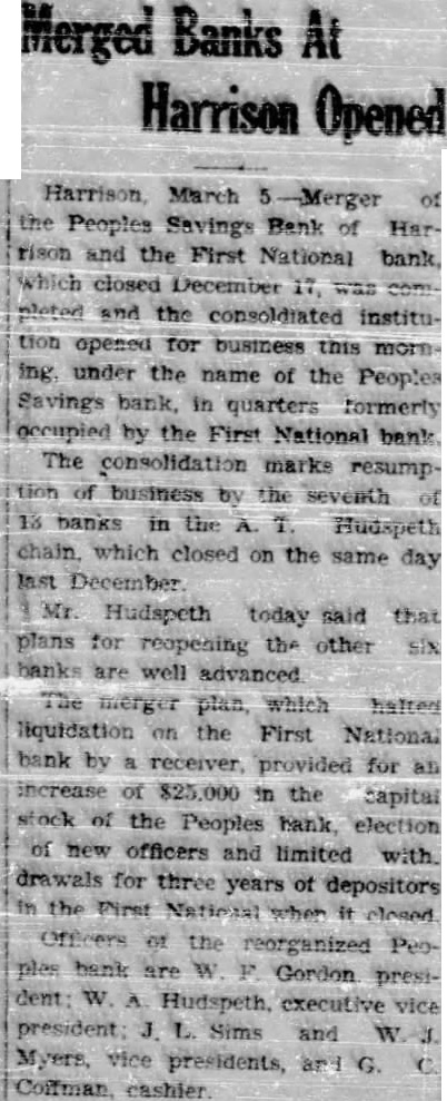 Merged Banks At Harrison Opened Harrison March 5-Mergerger of the Peoples Savings Bank of Harrison and the First National bank, which closed December 17, was completed and the consoldiated institution opened for business this morning, under the name of the Peoples Savings bank, in quarters formerly occupied by the First National bank The consolidation marks resumption of business by the seventh of 13 banks in the À. T. Hudspeth chain which closed on the same day last December Mr. Hudspeth today said that plans for reopening the other six banks are well advanced The merger plan, which halted liquidation on the First National bank by a receiver provided for an increase of $25,000 in the capital stock of the Peoples bank, election of new officers and limited with. drawals for three years of depositors in the First National when it closed Officers or the reorganized Peoples bank are W F. Gordon president: W À Hudspeth, executive vice president J. L. Sims and W.-J. Myers, vice presidents, an C