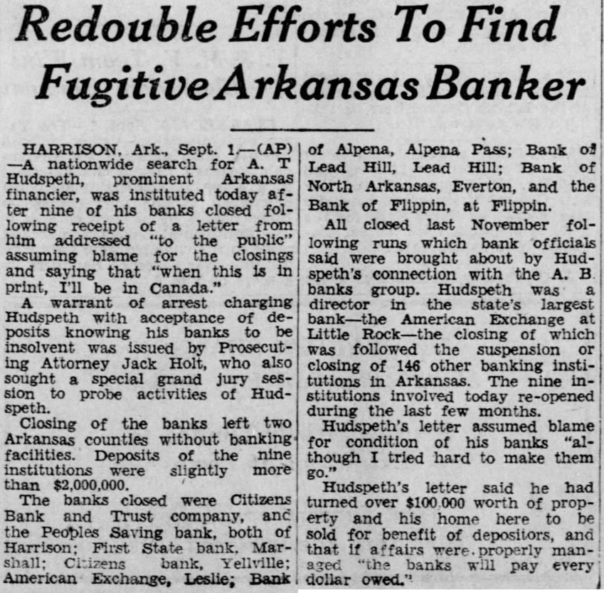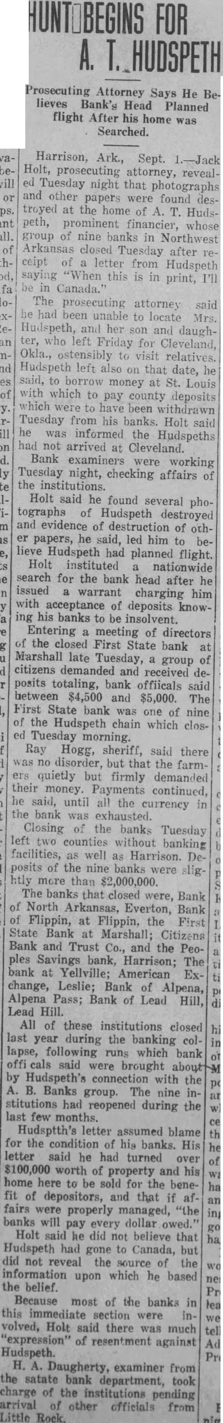 Prosecuting Attorney Says He Believes Bank's Head Planned flight After his home was Searched. Harrison, Ark., Sept. 1.-Jack Holt, prosecuting attorney, revealed Tuesday night that photographs and other papers were found destroyed at the home of Hudspeth, prominent financier, whose group of nine banks in Northwest Arkansas closed Tuesday after ceipt letter from Hudspeth saying "When this is in print, I'll in Canada.' The prosecuting attorney said he had been unable to locate Mrs. and her son and daughter, who left Friday for Cleveland, Okla., ostensibly to visit relatives. Hudspeth left also on that date, he to borrow money at St. Louis which to pay county deposits which were to have been withdrawn Tuesday from his banks. Holt said he was informed the Hudspeths had not arrived at Cleveland. Bank examiners were working Tuesday night, checking affairs of the institutions. Holt said he found several photographs of Hudspeth destroyed and evidence of destruction of other papers, he said, led him to lieve Hudspeth had planned flight. Holt instituted nationwide search for the bank head after he issued warrant charging him with acceptance of deposits knowing his banks to be insolvent. Entering meeting of directors of the closed First State bank at Marshall late Tuesday, group of citizens demanded and received deposits totaling, bank offiicals said between $4,500 and $5,000. The First State bank was one of nine of the Hudspeth chain which closed Tuesday morning. Ray Hogg, sheriff, said there no disorder, but that the farmers quietly but firmly demanded their money. Payments continued, said, until all the currency in the bank was exhausted. Closing of the banks Tuesday left two counties without banking facilities, as well as Harrison. posits of the nine banks were slightly more than $2,000,000. The banks that closed were, Bank North Arkansas, Everton, Bank of Flippin, at Flippin, the First State Bank at Marshall; Citizens Bank and Trust Co., and the Peoples Savings bank, Harrison; The bank at Yellville: American Exchange, Leslie: Bank of Alpena, Alpena Pass; Bank of Lead Hill, Hill. All of these institutions closed last year during the banking collapse, following runs which bank said were brought by Hudspeth's connection with the B. Banks group. The nine institutions had reopened during the last few months. Hudsptth's letter assumed blame for the condition of his banks. His letter said he had turned over $100,000 worth of property and his home here to be sold for the benefit of depositors, and that if af fairs were properly managed, "the banks will pay every dollar owed. Holt said he did not believe that Hudspeth had gone to Canada, but did not reveal the source of the information upon which he based belief. Because most of the banks in this immediate section were volved, Holt said there was much "expression" of resentment against Hudspeth. H. A. Daugherty, examiner from the satate bank department, took charge of the institutions pending arrival of other officials from Little