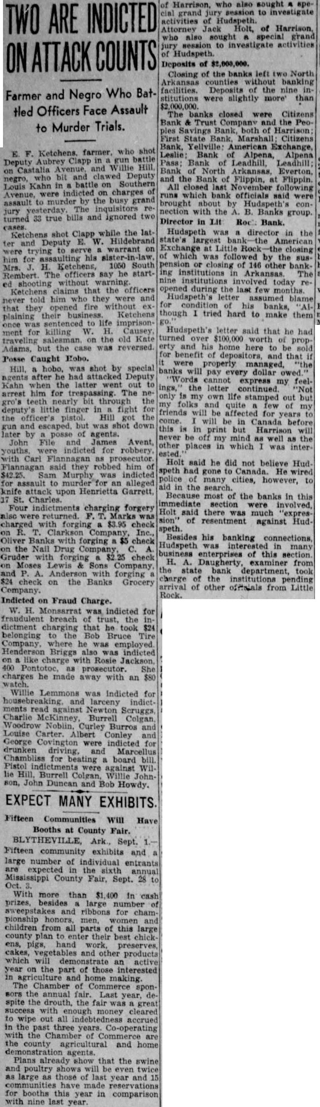 TWO ARE INDICTED ON ATTACK COUNTS Farmer and Negro Who Battled Officers Face Assault to Murder Trials. E. F. Ketchens. farmer, who shot Deputy Aubrey Clapp gun battle on Castalia Avenue, and Willie Hill, negro, who bit and clawed Deputy Louis Kahn in battle on Southern Avenue, were indicted on charges of assault to murder by the busy grand The inquisitors returned jury 33 true bills and ignored two cases Ketchens shot Clapp while the lat. ter and Deputy W. Hildebrand were trying warrant on him for assaulting his law. Mrs. J. H. Ketchens, 1050 South Rembert The officers say he started shooting without warning. Ketchens claims that the officers told him who they and that they opened fire without explaining their business. Ketchens once was sentenced to life imprisonment for killing W. H. Causey, traveling on the old Kate Adams, but the case was reversed. Posse Caught Hobo. Hill, hobo, was shot by special agents after he had attacked Deputy Kahn when the latter went out to arrest him for trespassing. The negro's teeth nearly bit through the deputy's little finger in fight for the officer's pistol. Hill got the gun and escaped. but was shot down later by posse of agents. John File and James Avent, youths, indicted for robbery, with Carl Flannagan as prosecutor. Flannagan said they robbed him of $42.25. Murphy was indicted for assault to murder for an alleged knife attack upon Henrietta Garrett, St. Charles. Four indictments charging forgery also were returned. T. Marks was charged with forging $3.95 check on R. T. Clarkson Company, Inc., Oliver Banks with forging $5 on the Nail Drug C. A. Gruder forging $2.25 check on Lewis Sons Company, and Anderson with forging $24 check on the Banks Grocery Company. Indicted on Fraud Charge. W. H. Monsarrat was indicted for fraudulent breach of trust, the dictment charging that he took belonging to the Bob Bruce Tire Company, where he was employed. Henderson Briggs also was indicted on like charge with Rosie Jackson, 400 Pontotoc, prosecutor. She charges he made away with an $80 Willie Lemmons was Indicted for and larceny indict ments read against Newton Scruggs Charlie McKinney, Burrell Colgan Woodrow Noblin, Curley Burros Louise Carter. Albert Conley and George Covington were indicted for drunken driving, and Marcellus Chambliss for beating board bill. Pistol were against Willie Hill, Burrell Colgan, Willie Johnson, John Duncan and Bob Howdy. EXPECT MANY EXHIBITS. Fifteen Communities Will Have Booths at County Fair. BLYTHEVILLE, Ark., Sept. Fifteen community exhibits and large number of individual entrants are expected in the sixth annual Mississippi Oct. County Fair, Sept. 28 to With more than $1,400 in cash prizes, besides large number and ribbons for championship men, and children from all parts of this large county plan to enter their best chick ens, pigs, hand work, preserves, cakes, vegetables and other products which will demonstrate an active year on the part of those interested in and home making. The Chamber of Commerce sors the annual fair. Last year, despite the drouth, the fair was great success with enough money cleared to wipe out all indebtedness accrued in the past three years. Co-operating with the Chamber of are the county agricultural and home agents. Plans already show that the swine and poultry shows will be even twice as large as those of last year and 15 communities have made reservations for booths this year in comparison with nine last year. of Harrison, who also sought a special grand session to investigate activities of Hudspeth. Attorney Jack Holt, of Harrison, who also sought special grand jury session to investigate activities of Hudspeth. Deposits of $2,000,000. Closing of the banks left two North Arkansas counties without banking facilities. Deposits of the nine institutions were slightly more than $2,000,000. The banks closed were Citizens Bank Trust Company and the Peoples Savings Bank, both of Harrison: First State Bank, Marshall; Citizens Bank, Yellville: American Exchange, Leslie: Bank of Alpena, Alpena Bank Leadhill, Bank of North Arkansas, Everton, and the Bank of Flippin, at Flippin. All closed last following runs which bank officials said were brought connection with the B. Banks group. Director in Lit Roc Bank. Hudspeth director in the American Exchange at Little Rock the closing of which was followed by the suspension closing of 146 other bank ing institutions in Arkansas The nine institutions today reopened during the last few months. Hudspeth's blame for condition his banks, though tried hard to make them go. Hudspeth's letter said that he had turned $100,000 of property and his home here to be sold for benefit of and that were properly managed, banks will pay every dollar "Words cannot express my feelings, the letter only is my own life stamped out but my folks and quite few of my friends will be affected for years to come. will be in Canada this is in print but Harrison will never be off my mind as well as the other places in which was interHolt said he did not believe Hud speth had gone Canada He wired police of many cities, however, to aid in the search. Because most of the banks in this immediate section were involved, Holt said there much "expression" of resentment against Hud. speth Besides his banking connections, Hudspeth was interested in many business enterprises of this section. H. A. Daugherty, examiner from the state bank department, took charge of the institutions pending arrival of other officials from Little Rock.