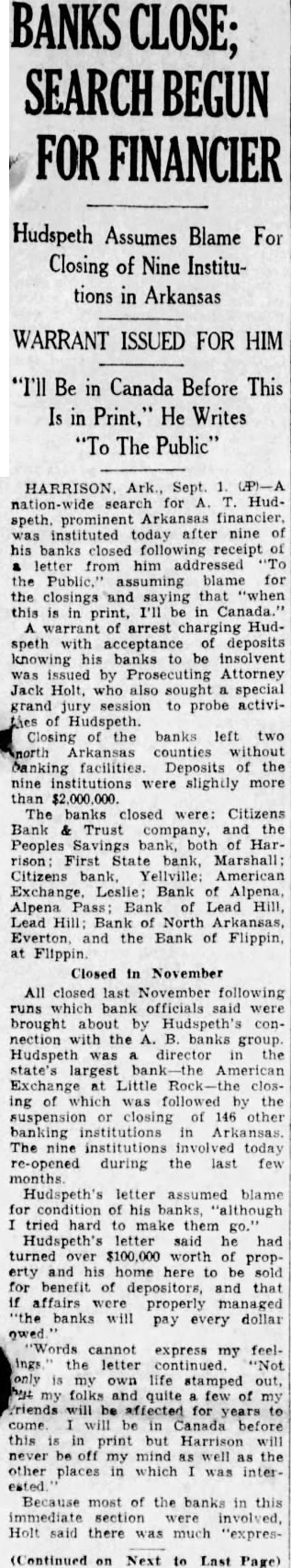 BANKS CLOSE; SEARCH BEGUN FOR FINANCIER Hudspeth Assumes Blame For Closing of Nine Institutions in Arkansas WARRANT ISSUED FOR HIM "I'll Be in Canada Before This Is in Print," He Writes "To The Public" HARRISON. Ark., Sept. (P)-A nation-wide for Hudspeth. prominent financier, instituted today after nine his banks closed receipt from him addressed the assuming blame the closings saying that "when this is in print, in Canada. warrant arrest charging Hudspeth with acceptance deposits knowing his banks be insolvent was issued Prosecuting Attorney Jack Holt, who also special grand session to probe activiHudspeth. Closing banks left two Arkansas banking facilities. Deposits of the nine institutions slightly $2,000,000. The banks closed were: Citizens Bank Trust and the Peoples Savings bank, both Harrison: First State bank, Marshall: Citizens bank, Yellville: American Exchange Bank Alpena, Alpena Bank Lead Hill, the Bank of Flippin, at Closed in November All closed last November following bank officials said brought by nection the banks group. Hudspeth state's Exchange Little closing which was followed by the suspension closing 146 other banking institutions Arkansas The institutions involved re-opened during the few Hudspeth's letter assumed blame for his tried hard Hudspeth's letter had turned $100,000 worth of property and his home here to be sold for benefit depositors, that affairs properly managed banks will pay every dollar "Words cannot feel. express my my own life stamped out, my Priends affected for come Canada before this in print but Harrison never my mind other places which interBecause most of the banks in this immediate Holt said there much (Continued Next to Last Page)