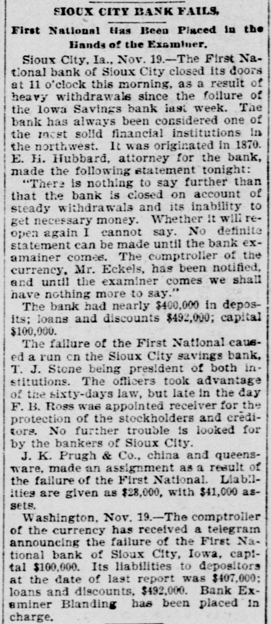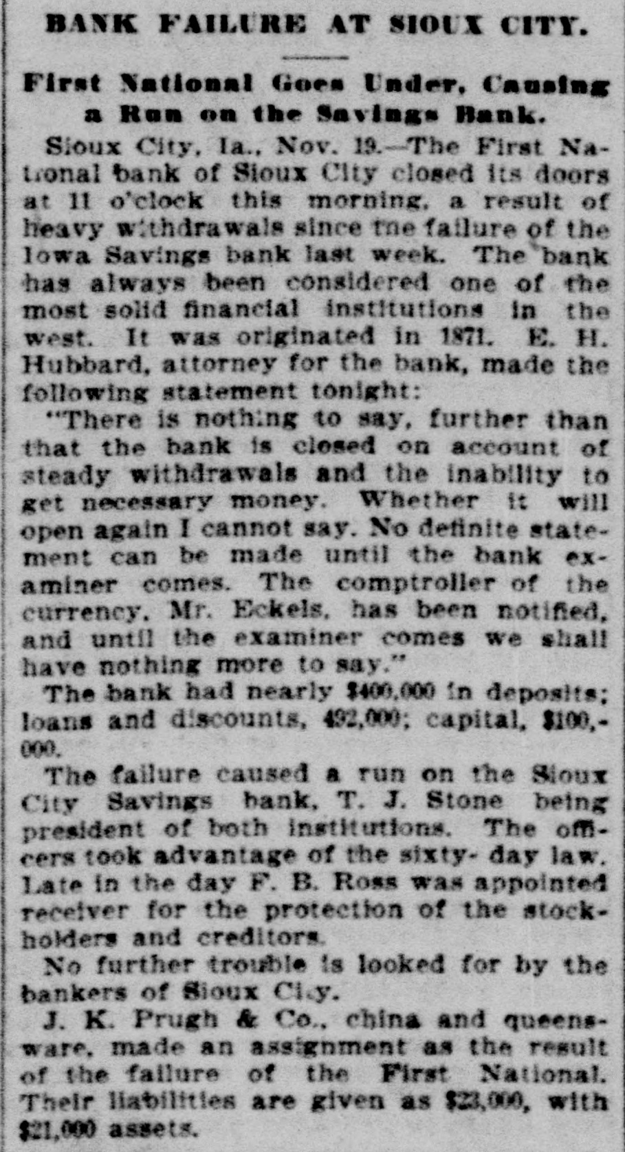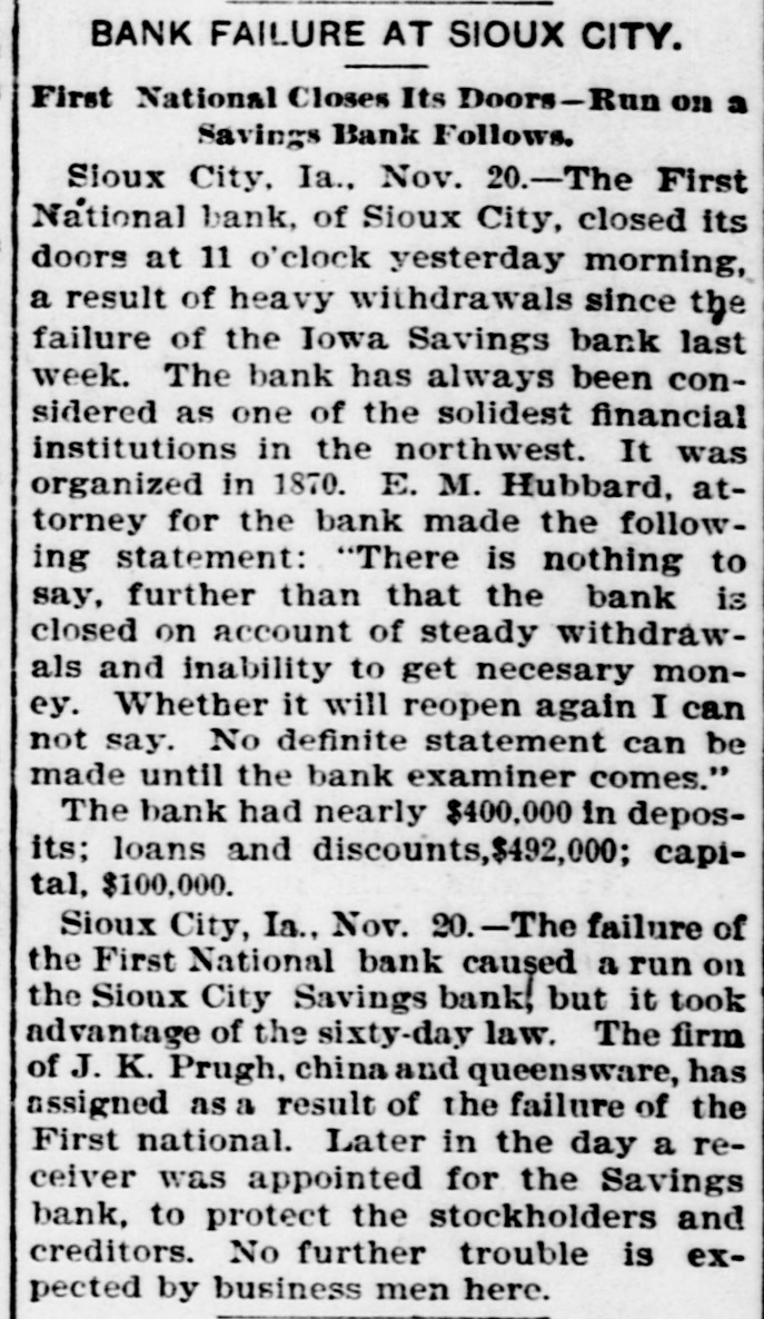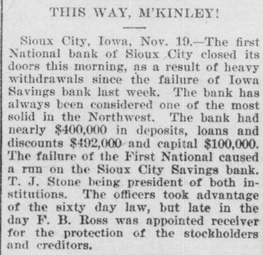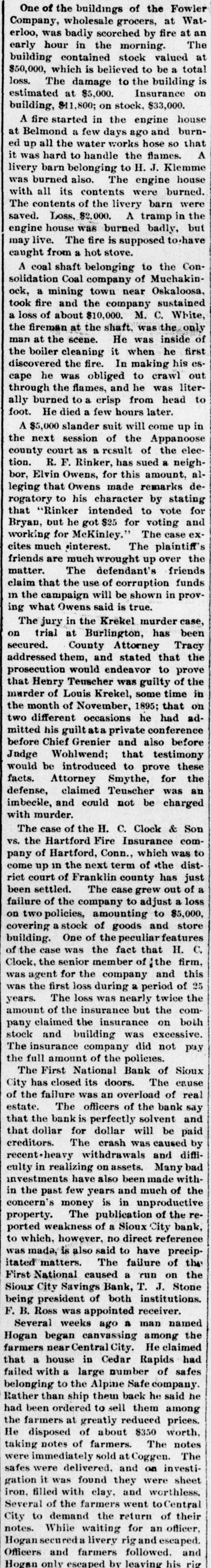 One of the buildings of the Fowler Company, wholesale grocers, at Waterloo, was badly scorched by fire at an early hour in the morning. The building contained stock valued at $50,000, which is believed to be a total loss. The damage to the building is estimated at $5,000. Insurance on building, $11,800; on stock, $33,000. A fire started in the engine house at Belmond a few days ago and burned up all the water works hose so that it was hard to handle the flames. A livery barn belonging to H. J. Klemme was burned also. The engine house with all its contents were burned. The contents of the livery barn were saved. Loss, $2.000. A tramp in the engine house was burned badly, but may live. The fire is supposed to.have caught from a hot stove. A coal shaft belonging to the Consolidation Coal company of Muchakinock, a mining town near Oskaloosa, took fire and the company sustained a loss of about $10,000. M. C. White, the fireman at the shaft, was the only man at the scene. He was inside of the boiler cleaning it when he first discovered the fire. In making his escape he was obliged to crawl out through the flames, and he was literally burned to a crisp from head to foot. He died a few hours later. A $5,000 slander suit will come up in the next session of the Appanoose county court as a result of the election. R. F. Rinker, has sued a neighbor, Elvin Owens, for this amount, alleging that Owens made remarks derogatory to his character by stating that "Rinker intended to vote for Bryan, but he got $25 for voting and working for McKinley." The case excites much ...interest. The plaintiff's friends are much wrought up over the matter. The defendant's friends claim that the use of corruption funds in the campaign will be shown in proving what Owens said is true. The jury in the Krekel murder case, on trial at Burlington, has been secured. County Attorney Tracy addressed them, and stated that the prosecution would endeavor to prove that Henry Tenscher was guilty of the murder of Louis Krekel, some time in the month of November, 1895; that on two different occasions he had admitted his guilt ata private conference before Chief Grenier and also before Jndge Wohlwend; that testimony would be introduced to prove these facts. Attorney Smythe, for the defense, claimed Teuscher was an imbecile, and could not be charged with murder. The case of the H. C. Clock & Son VS. the Hartford Fire Insurance company of Hartford, Conn., which was to come up in the next term of the district court of Franklin county has just been settled. The case grew out of a failure of the company to adjust a loss on two policies, amounting to $5,000, covering a stock of goods and store building. One of the peculiar features of the case was the fact that H. C. Clock, the senior member of |the firm, was agent for the company and this was the first loss during a period of 25 years. The loss was nearly twice the amount of the insurance but the company claimed the insurance on both stock and building was excessive. The insurance company did not pay the full amount of the policies. The First National Bank of Sioux City has closed its doors. The cause of the failure was an overload of real estate. The officers of the bank say that the bank is perfectly solvent and that dollar for dollar will be paid creditors. The crash was caused by recent·heavy withdrawals and difficulty in realizing on assets. Many bad investments have also been made within the past few years and much of the concern's money is in unproductive property. The publication of the reported weakness of a Sioux City bank, to which, however, no direct reference have 04 pies also sp 'epear SEM itated matters. The failure of the First National caused a run on the Sioux City Savings Bank, T. J. Stone being president of both institutions. F. B. Ross was appointed receiver. Several weeks ago a man named Hogan began canvassing among the farmers near Central City. He claimed that a house in Cedar Rapids had failed with a large number of safes belonging to the Alpine Safe company. Rather than ship them back he said he