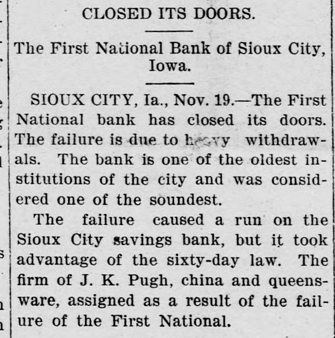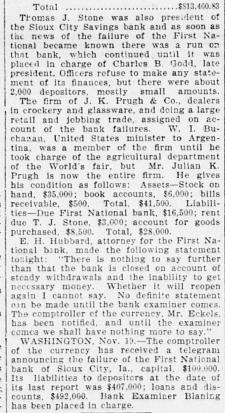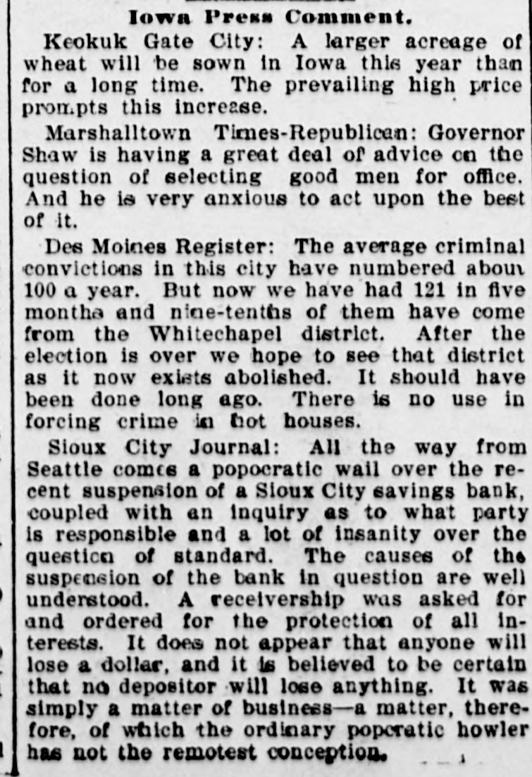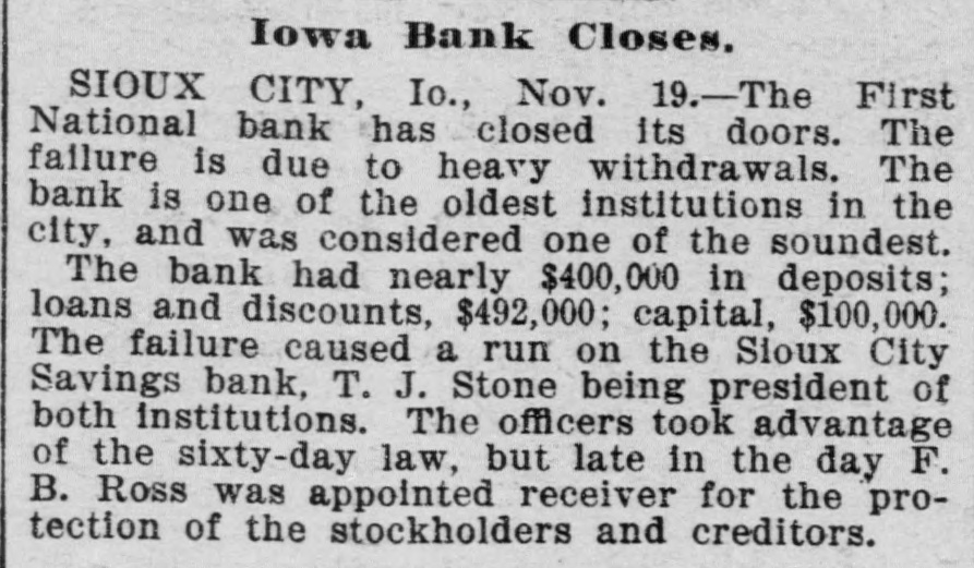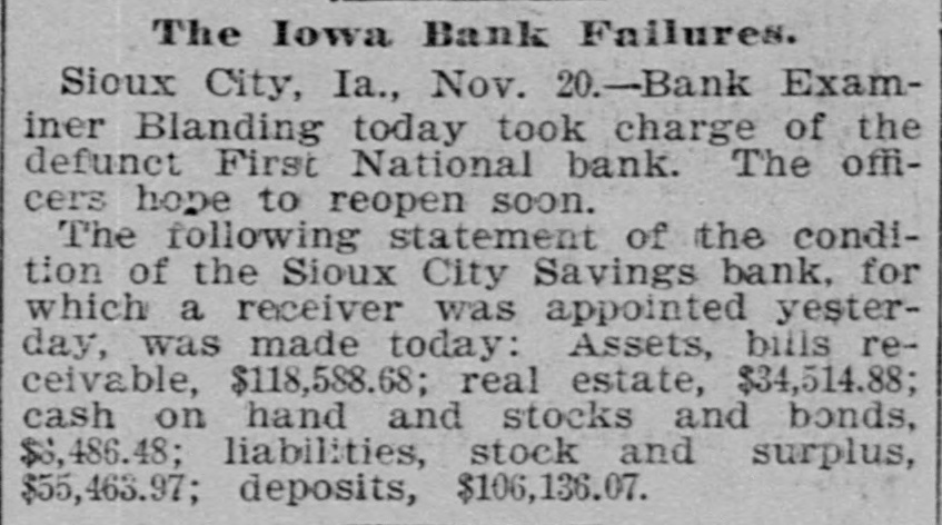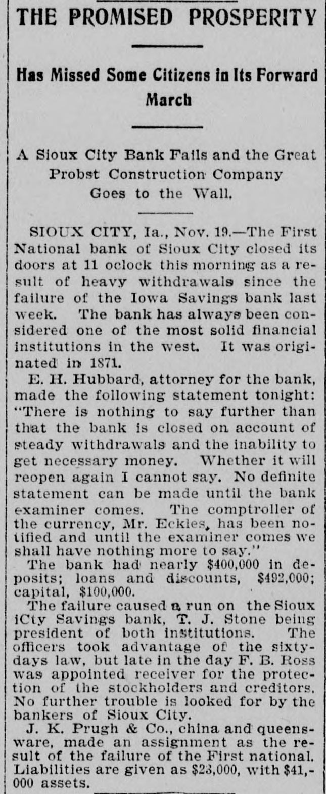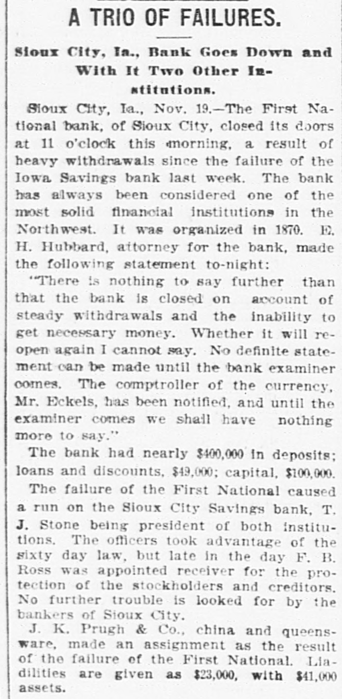 One of the buildings of the Fowler Company, wholesale grocers, at Waterloo, was badly scorched by fire at an early hour in the morning. The building contained stock valued at $50,000, which is believed to be a total loss. The damage to the building is estimated at $5,000. Insurance on building, $11,800; on stock, $33,000. A fire started in the engine house at Belmond a few days ago and burned up all the water works hose so that it was hard to handle the flames. A livery barn belonging to H. J. Klemme was burned also. The engine house with all its contents were burned. The contents of the livery barn were saved. Loss, $2.000. A tramp in the engine house was burned badly, but may live. The fire is supposed to.have caught from a hot stove. A coal shaft belonging to the Consolidation Coal company of Muchakinock, a mining town near Oskaloosa, took fire and the company sustained a loss of about $10,000. M. C. White, the fireman at the shaft, was the only man at the scene. He was inside of the boiler cleaning it when he first discovered the fire. In making his escape he was obliged to crawl out through the flames, and he was literally burned to a crisp from head to foot. He died a few hours later. A $5,000 slander suit will come up in the next session of the Appanoose county court as a result of the election. R. F. Rinker, has sued a neighbor, Elvin Owens, for this amount, alleging that Owens made remarks derogatory to his character by stating that "Rinker intended to vote for Bryan, but he got $25 for voting and working for McKinley." The case excites much ...interest. The plaintiff's friends are much wrought up over the matter. The defendant's friends claim that the use of corruption funds in the campaign will be shown in proving what Owens said is true. The jury in the Krekel murder case, on trial at Burlington, has been secured. County Attorney Tracy addressed them, and stated that the prosecution would endeavor to prove that Henry Tenscher was guilty of the murder of Louis Krekel, some time in the month of November, 1895; that on two different occasions he had admitted his guilt ata private conference before Chief Grenier and also before Jndge Wohlwend; that testimony would be introduced to prove these facts. Attorney Smythe, for the defense, claimed Teuscher was an imbecile, and could not be charged with murder. The case of the H. C. Clock & Son VS. the Hartford Fire Insurance company of Hartford, Conn., which was to come up in the next term of the district court of Franklin county has just been settled. The case grew out of a failure of the company to adjust a loss on two policies, amounting to $5,000, covering a stock of goods and store building. One of the peculiar features of the case was the fact that H. C. Clock, the senior member of |the firm, was agent for the company and this was the first loss during a period of 25 years. The loss was nearly twice the amount of the insurance but the company claimed the insurance on both stock and building was excessive. The insurance company did not pay the full amount of the policies. The First National Bank of Sioux City has closed its doors. The cause of the failure was an overload of real estate. The officers of the bank say that the bank is perfectly solvent and that dollar for dollar will be paid creditors. The crash was caused by recent·heavy withdrawals and difficulty in realizing on assets. Many bad investments have also been made within the past few years and much of the concern's money is in unproductive property. The publication of the reported weakness of a Sioux City bank, to which, however, no direct reference have 04 pies also sp 'epear SEM itated matters. The failure of the First National caused a run on the Sioux City Savings Bank, T. J. Stone being president of both institutions. F. B. Ross was appointed receiver. Several weeks ago a man named Hogan began canvassing among the farmers near Central City. He claimed that a house in Cedar Rapids had failed with a large number of safes belonging to the Alpine Safe company. Rather than ship them back he said he