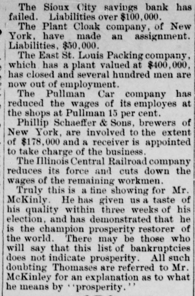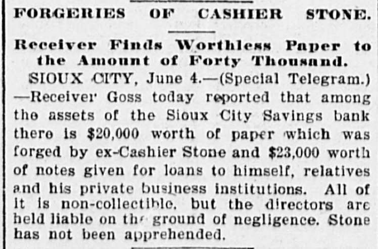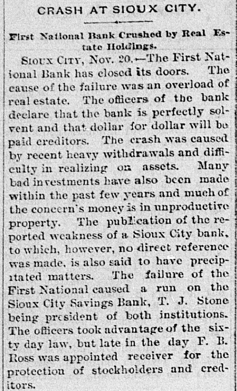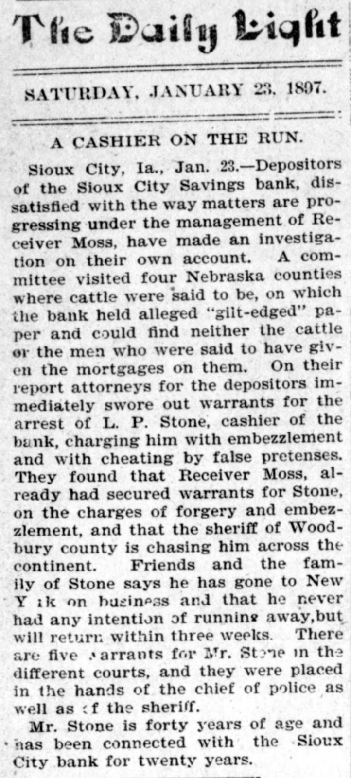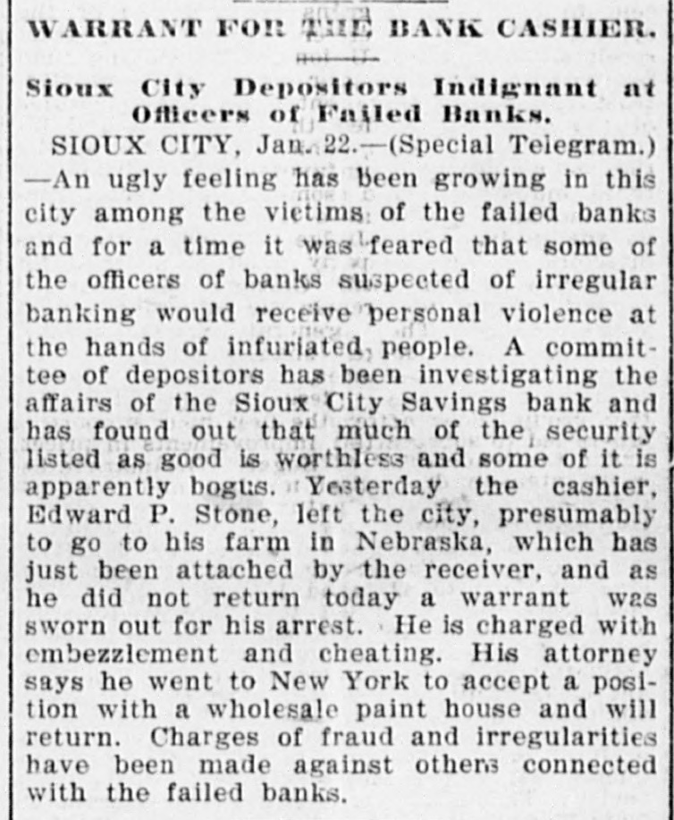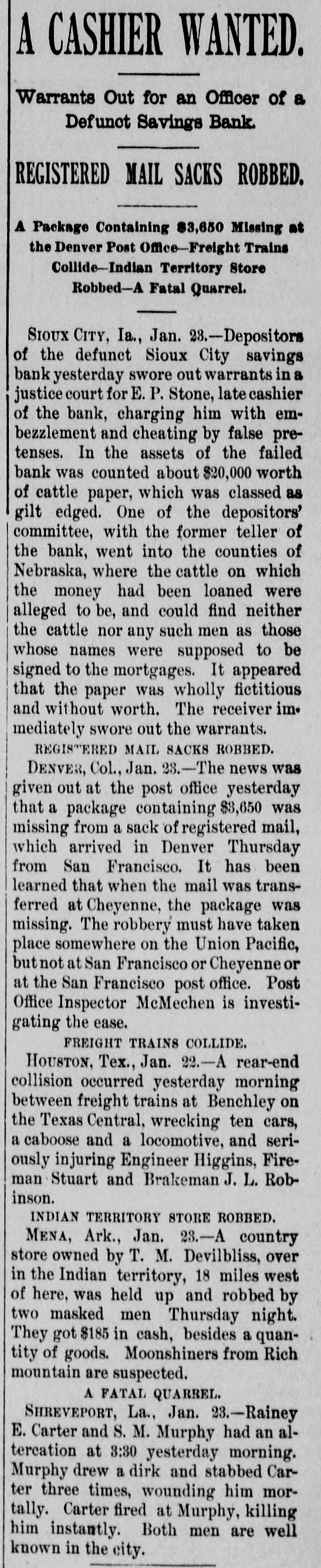 One of the buildings of the Fowler Company, wholesale grocers, at Waterloo, was badly scorched by fire at an early hour in the morning. The building contained stock valued at $50,000, which is believed to be a total loss. The damage to the building is estimated at $5,000. Insurance on building, $11,800; on stock, $33,000. A fire started in the engine house at Belmond a few days ago and burned up all the water works hose so that it was hard to handle the flames. A livery barn belonging to H. J. Klemme was burned also. The engine house with all its contents were burned. The contents of the livery barn were saved. Loss, $2.000. A tramp in the engine house was burned badly, but may live. The fire is supposed to.have caught from a hot stove. A coal shaft belonging to the Consolidation Coal company of Muchakinock, a mining town near Oskaloosa, took fire and the company sustained a loss of about $10,000. M. C. White, the fireman at the shaft, was the only man at the scene. He was inside of the boiler cleaning it when he first discovered the fire. In making his escape he was obliged to crawl out through the flames, and he was literally burned to a crisp from head to foot. He died a few hours later. A $5,000 slander suit will come up in the next session of the Appanoose county court as a result of the election. R. F. Rinker, has sued a neighbor, Elvin Owens, for this amount, alleging that Owens made remarks derogatory to his character by stating that "Rinker intended to vote for Bryan, but he got $25 for voting and working for McKinley." The case excites much ...interest. The plaintiff's friends are much wrought up over the matter. The defendant's friends claim that the use of corruption funds in the campaign will be shown in proving what Owens said is true. The jury in the Krekel murder case, on trial at Burlington, has been secured. County Attorney Tracy addressed them, and stated that the prosecution would endeavor to prove that Henry Tenscher was guilty of the murder of Louis Krekel, some time in the month of November, 1895; that on two different occasions he had admitted his guilt ata private conference before Chief Grenier and also before Jndge Wohlwend; that testimony would be introduced to prove these facts. Attorney Smythe, for the defense, claimed Teuscher was an imbecile, and could not be charged with murder. The case of the H. C. Clock & Son VS. the Hartford Fire Insurance company of Hartford, Conn., which was to come up in the next term of the district court of Franklin county has just been settled. The case grew out of a failure of the company to adjust a loss on two policies, amounting to $5,000, covering a stock of goods and store building. One of the peculiar features of the case was the fact that H. C. Clock, the senior member of |the firm, was agent for the company and this was the first loss during a period of 25 years. The loss was nearly twice the amount of the insurance but the company claimed the insurance on both stock and building was excessive. The insurance company did not pay the full amount of the policies. The First National Bank of Sioux City has closed its doors. The cause of the failure was an overload of real estate. The officers of the bank say that the bank is perfectly solvent and that dollar for dollar will be paid creditors. The crash was caused by recent·heavy withdrawals and difficulty in realizing on assets. Many bad investments have also been made within the past few years and much of the concern's money is in unproductive property. The publication of the reported weakness of a Sioux City bank, to which, however, no direct reference have 04 pies also sp 'epear SEM itated matters. The failure of the First National caused a run on the Sioux City Savings Bank, T. J. Stone being president of both institutions. F. B. Ross was appointed receiver. Several weeks ago a man named Hogan began canvassing among the farmers near Central City. He claimed that a house in Cedar Rapids had failed with a large number of safes belonging to the Alpine Safe company. Rather than ship them back he said he