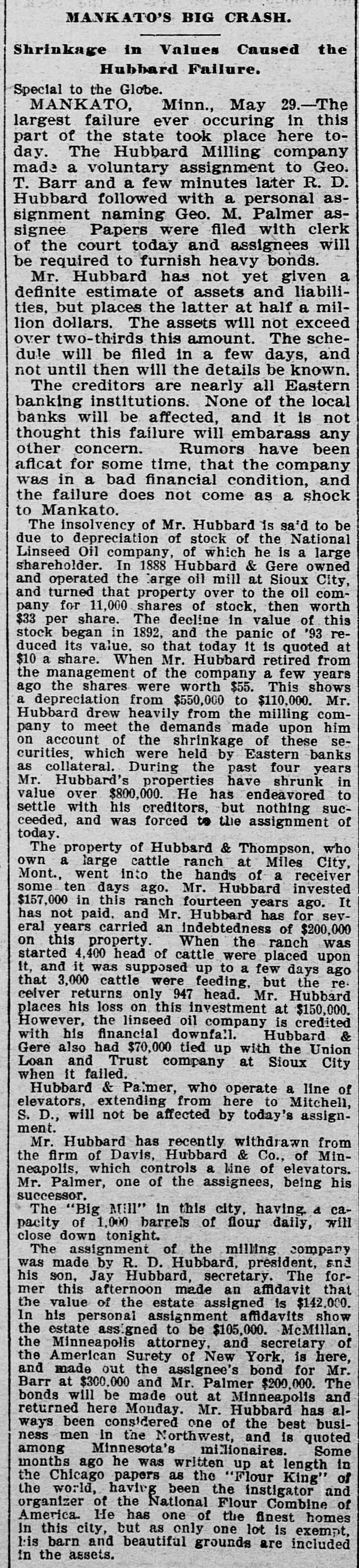 ΜΑΝΚΑΤΟ, Minn., May 29.-The largest failure ever occuring in this part of the state took place here today. The Hubbard Milling company made a voluntary assignment to Geo. T. Barr and a few minutes later R. D. Hubbard followed with a personal assignment naming Geo. M. Palmer as-signee Papers were filed with clerk of the court today and assignees will be required to furnish heavy bonds.