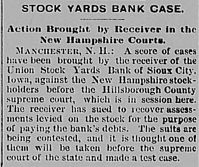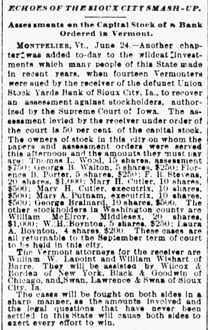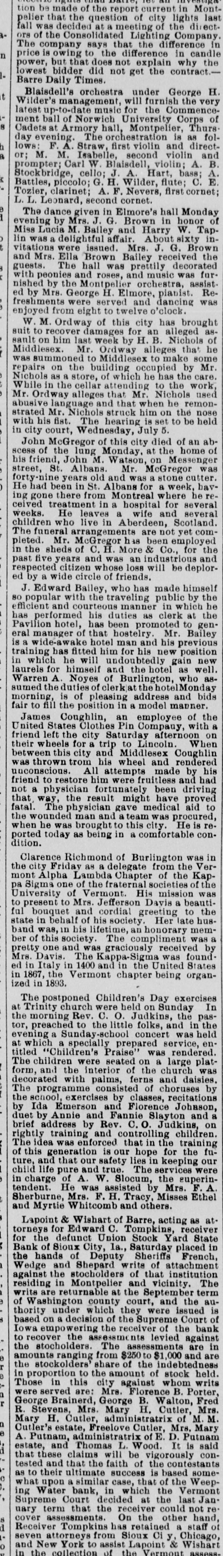 the of the Light Company the that why power, the did not the get bidder contract Times. H under George the very Nor Montpet as is Barre Blaisdell's Daily orchestra Agement, will for the Comment Corps Thurs of folerror IOWH direct M M W latest ment ball of Armore hall, Orchestrain and and Carl Cadeteening Straw, The first second violin violin A B G. day Isabelle Blaisder Hart, base; C. F A Nevers, Wilder, flute; first cornet; cornet. hall Monday of Battles, Clarinet second in Elmore's Brown in W. honor TapinThe L. dance Mr given J. G and Harry Abou aixty Brow evening Luci by M Bailey affair Mrs. J receiverated G. ived the Miss was a Bailey was for lin vitations were Ella Brown was and music assist Reand Mrs. The hall the roses, orchesania Chestra, planist was with peonies and Montpo H Elmore, dancing nished by George served and ve 'clock brought recover by MrH. were to city has alleged as- of freewed from enjoyed eight of this for an Nichols he to W M week H allemake lleges B. tha Home has the suit to on him last Mr. Ordway Middlesex to by care Mr. MiddlessXone building he to the work used on store, of wanding Nichola remonNichola repairs as a cellar that Mr. when he nose While in the alleges that him on to the be held Mr. abused Mr. "Nichola The hearing July 5. of an abof Messe strated with court, fist. nesday, of this city at died the home was Albans a ACESS John of the Johnson M. Mr. was in city McG regor lung Monday. Watson McGrego on tter. He bay week he restreet, his friend, years St. Albanireal and for where everal forty had nine been there in from Montrea hospits wife and for notland. several has ing gone treat leaves a herdeen, not employed yet comCo., celved weeks. who He live ements in are been emploies for the and The children funeral Mr. McGrek More indus & be deplorthe citizen whose of friends. pleted sheds of and C. was 1088 an will himself circle who has public made which by the be hotel ed by Edward wide Bailey the raveling manner clerk in at gen- the J. popular and his duties prom mr as oted to Bailey him has been hoste and his position previous btedly as has vilion of that hotel man for his new gain well. new Warren the sumed has fitted will und the hotel who Monda: asis of morning, pleasing a training which he himself of and Burlington, and bids in fill the fair to position of an in laurels for A duties Noyes of clerk address model manner. the Coughlin, employee Pin with Comolothes Company, on When city his Jamestates city Saturduincoln rendered Coughlin and friend United wheels left the for a and trip wheel Middland made by had his betw their een thrown this trom All attemptruitless were been driving proved uncons was nacious. to restore might have ocured, aid to in friend not a phy physician the sician result gave team was procured He is re. contoday ported the when he was as being fandwounded that way, The physic man brought this city. table of in was Burlingto Verthe from the Kapa dition. Clare Friday Richmond bda delegate Chapter mission of ties of was the the city Alpha Lam of the His Davis beauti the his state was, in mont Mrs. Jefferson cordial freeting Her late to mem- husThe University present to and his society honorary was a Mrs. ful to bonquet in behalf of lifetime, recei found by in Italy band of this society was Graciously United was organ- States ed 1867, the Vermont pretty ber Davis one and in The 1400 Kappa chapter the being ized in in 1893. Day exercises In Sunday pasChildren's held on the the evening The postponed church were C Judkins, folks,! and was in held Praise at Trinity morning Rev to the school little pared concert grandered rvice, ena on tor, the prepa was large plat. was which "Child Wildren's were created of the and church daisi by the by The titled children the interior palms, ferns of chocolations horuses Florence form, and ated with Johason, and The program exercise Fannie o Slaydring, Judkindren on by Ida by Annie by and Rev. Strolling the training fuis our child brief duet address training forced and that hope keeping for the our were of The rightly was our safety lies The serv Services the euperli F.A. of ture, this and life pure that A. and W. true. sisted Slocum, by Misses Mrs. Ethel attorneys in tendent. Aberburne, charge He Mrs. Whitcomb was W F. H. and Thothers. Barre, acting receiver as and Myrtie & Wishart C. of Tompkiyard Bankkins, placed in State Lapoint defunct Edward Union 1a., Stock Saturday Sheriffs French, for the of Sioux City, Deputy rite of attacistion institutic The the Bank hands and of Sholders Shepard and of that vicinity. term against Wedge the Montpolite stockneller the September and issued au- is residing in returncy they court, preme were Court bank of Washington of underision which of recen the levied of the against in based thority on a wering the aments and are are Iowaever empo the The 000 to recover dere stoc from $250 of the stock writs held. the amounts ranging the share Amount of whom Porter, the proportio stockoon this to city Mrs. Flore Walton, B. Fred Mrs. Those in served in are: George B. H. Cutler, of M M Cutler, were George Brainerey Mrs. admir Mrs. Patnam Mary Mary estateministration Wood. R. Steven H. Cutler, Freelon reelove of E. ously D. It 18 con- said that Cutler's Putnam. Thomas will L be vigoroustants the estate, A. these clat the claims faith success of is of based the Weep- someVermont Supreme that Suprete that tested to their and ultimate a similar case, which that the the last Jan- re what as upon bank, recided in at ver could not hand of retained ing Water Court the rece On the other staff Chicago, and seven New York to of the cover assist Vermont the uary transments. has Sioux Wishart