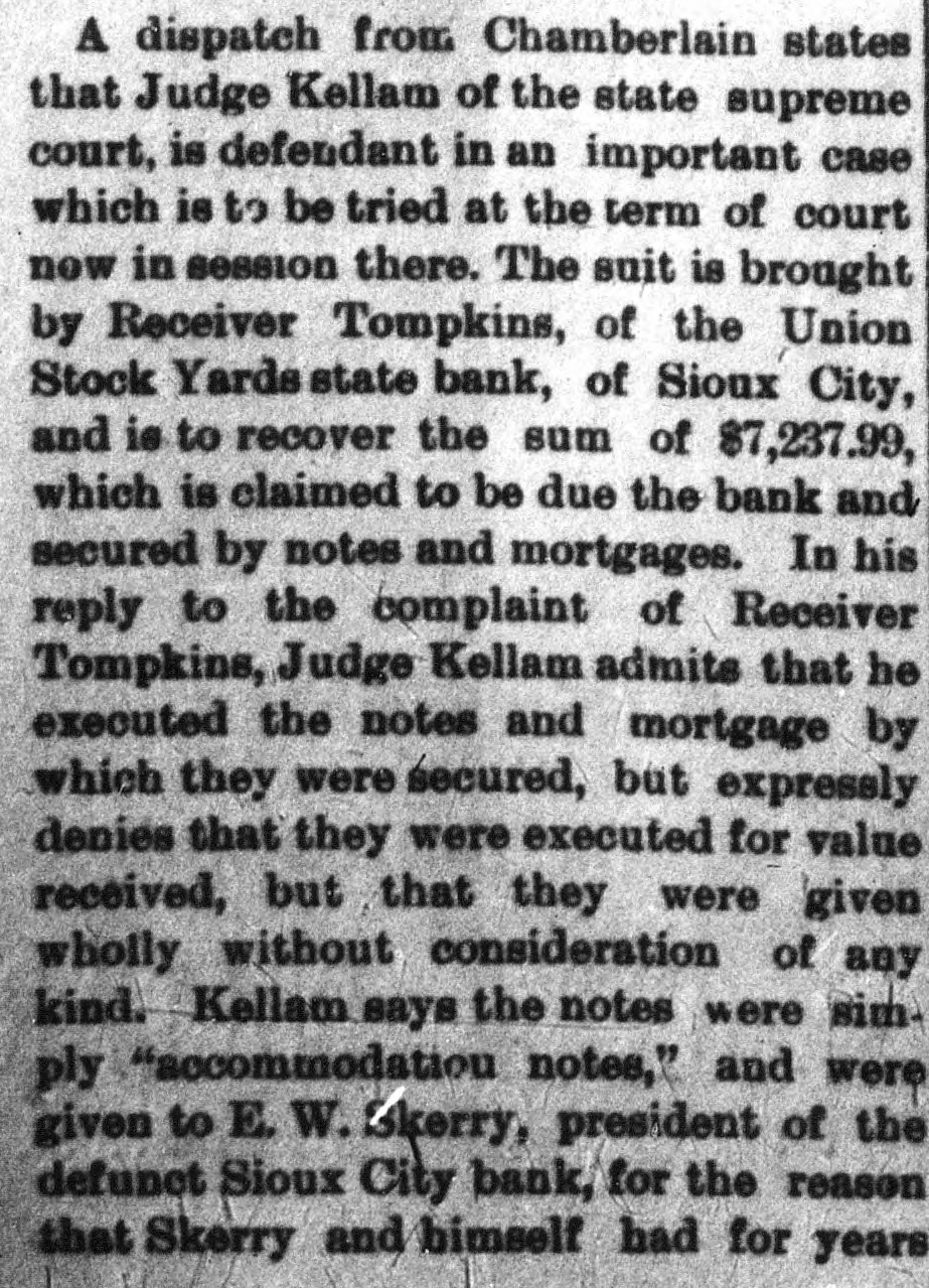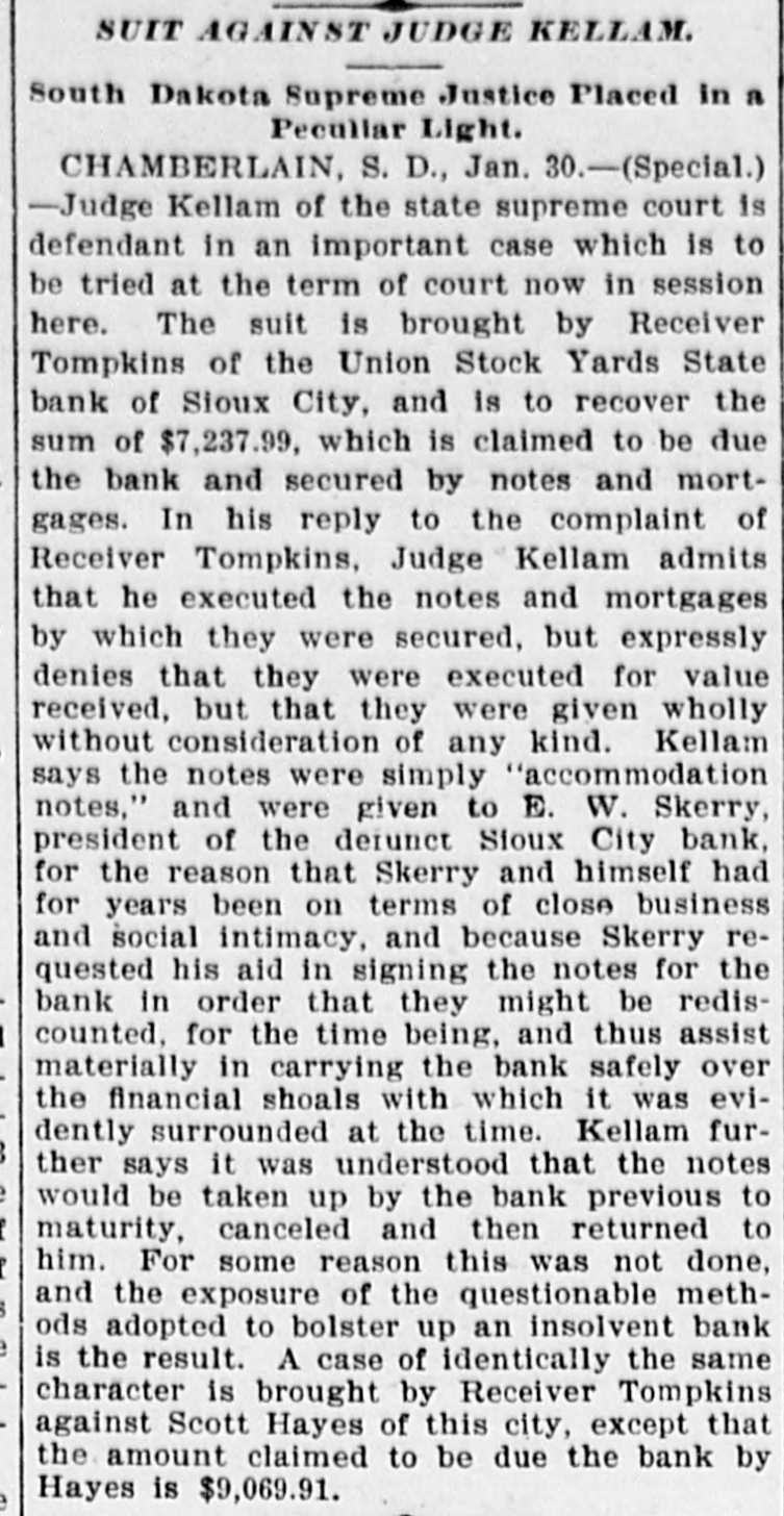 SUIT AGAINST JUDGE KELLAM. South Dakota Supreme Justice Placed in a Peculiar Light. CHAMBERLAIN, S. D., Jan. 30.-(Special.) -Judge Kellam of the state supreme court is defendant in an important case which is to be tried at the term of court now in session here. The suit is brought by Receiver Tompkins of the Union Stock Yards State bank of Sioux City, and is to recover the sum of $7,237.99, which is claimed to be due the bank and secured by notes and mortgages. In his reply to the complaint of Receiver Tompkins, Judge Kellam admits that he executed the notes and mortgages by which they were secured, but expressly denies that they were executed for value received, but that they were given wholly without consideration of any kind. Kellam says the notes were simply "accommodation notes," and were given to E. W. Skerry, president of the defunct Sioux City bank, for the reason that Skerry and himself had for years been on terms of close business and social intimacy, and because Skerry requested his aid in signing the notes for the bank in order that they might be rediscounted, for the time being, and thus assist materially in carrying the bank safely over the financial shoals with which it was evidently surrounded at the time. Kellam further says it was understood that the notes would be taken up by the bank previous to maturity, canceled and then returned to him. For some reason this was not done, and the exposure of the questionable methods adopted to bolster up an insolvent bank is the result. A case of identically the same character is brought by Receiver Tompkins against Scott Hayes of this city, except that the amount claimed to be due the bank by Hayes is $9,069.91.