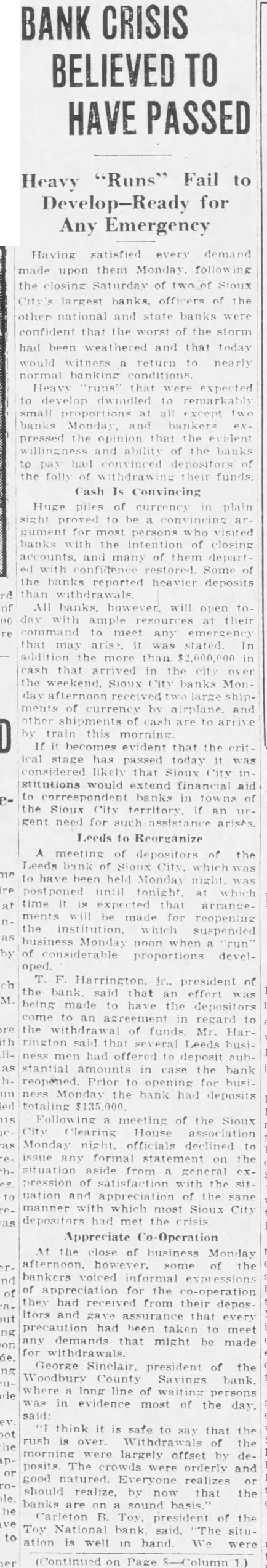 BANK CRISIS BELIEVED TO HAVE PASSED "Runs" Fail to Heavy Develop-Ready for Any Emergency Having satisfied every demand upon them Monday following the closing Saturday of Sioux officers of the national and banks confident that the worst of the storm been weathered and that today witness return to nearly banking conditions Heavy that were expected dwindled to remarkably except Monday bankers pressed opinion that the and ability of the banks convinced depositors of their funds Cash Is Convincing Huge of currency plain sight to convincing for persons visited intention of closing and many of them depart restored Some the banks deposits All open ample at their command In the more than that the banks currency and shipments are arrive train this morning becomes evident that the stage has passed today likely that Sioux stitutions would extend financial aid to banks in of City territory an gent need for such Leeds to Reorganize meeting of depositors of of to held Monday postponed tonight time that ments made the suspended Monday of proportions develpresident of the bank that an effort was being made have come to an regard to the of Mr funds that Leeds busihad to deposit stantial in case the bank Prior opening for busithe bank had deposits totaling Following of the Sioux Clearing House Monday officials declined issue statement on the situation from pression of satisfaction with the nation and appreciation manner which most Sioux City depositors had met the Appreciate Co-Operation At close of business Monday some of the bankers voiced informal expressions appreciation for the co-operation they received from their deposand assurance that every precaution had been taken to meet any demands that might be made George Sinclair, president of the Woodbury County bank where long line of persons was in evidence most of the day. think it is safe to say that the rush over. Withdrawals of the morning were largely offset by deposits The orderly and good Everyone realizes should realize. by now that the banks sound basis. Carleton B. Toy president of the Toy bank "The situis well hand. (Continued on Page S-Column 1.)