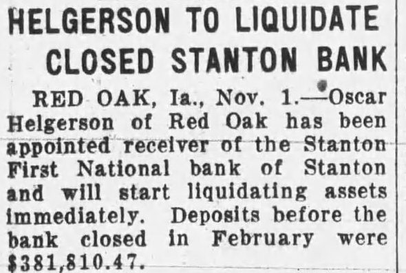 HELGERSON TO LIQUIDATE CLOSED STANTON BANK RED OAK, Ia., Nov. -Oscar Helgerson of Red Oak has been appointed of the Stanton First National bank of Stanton and will start liquidating assets immediately Deposits before the bank closed in February were $381,810.47.