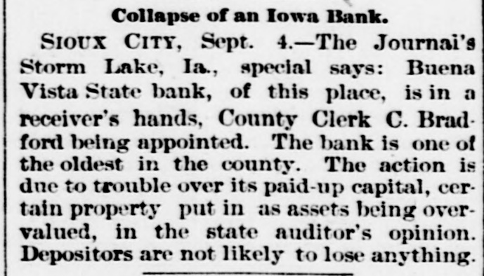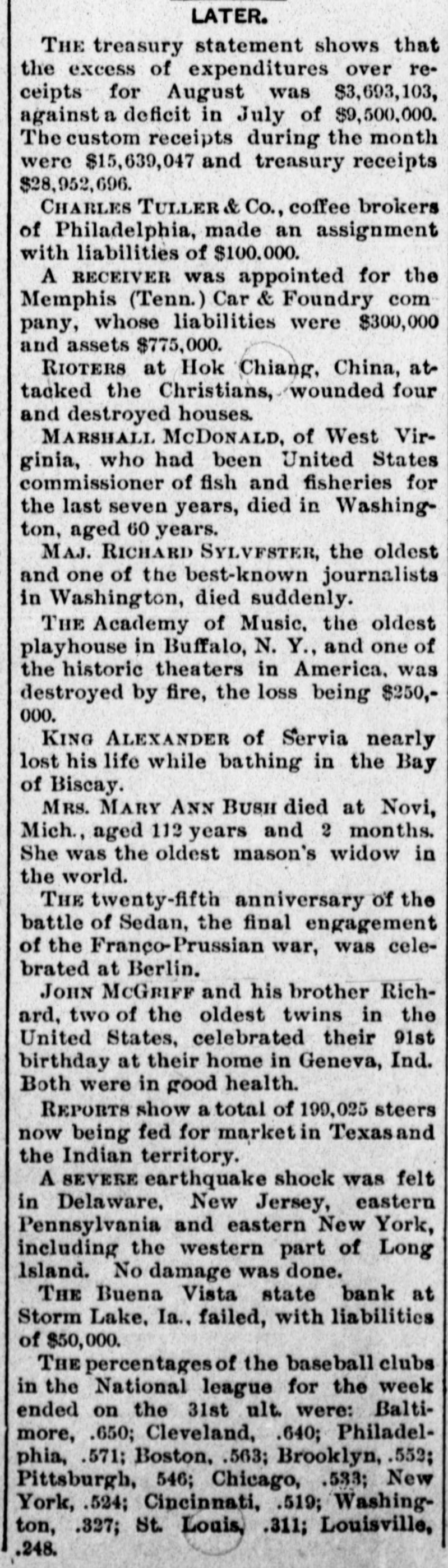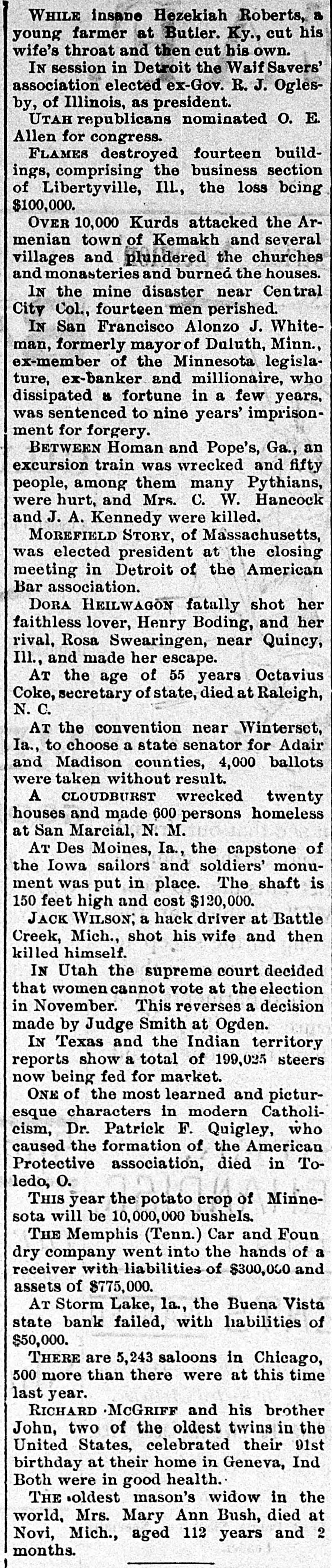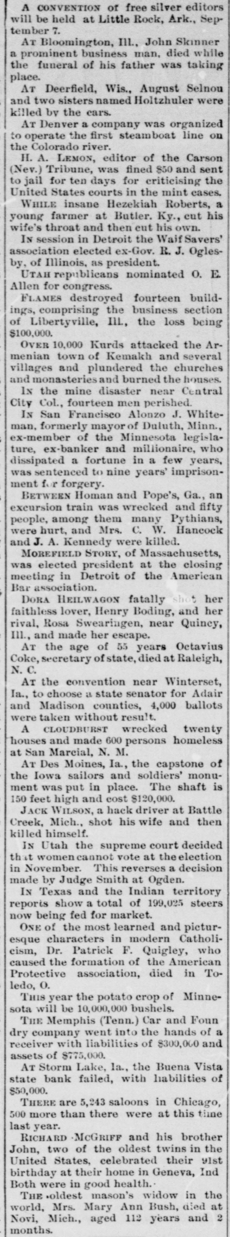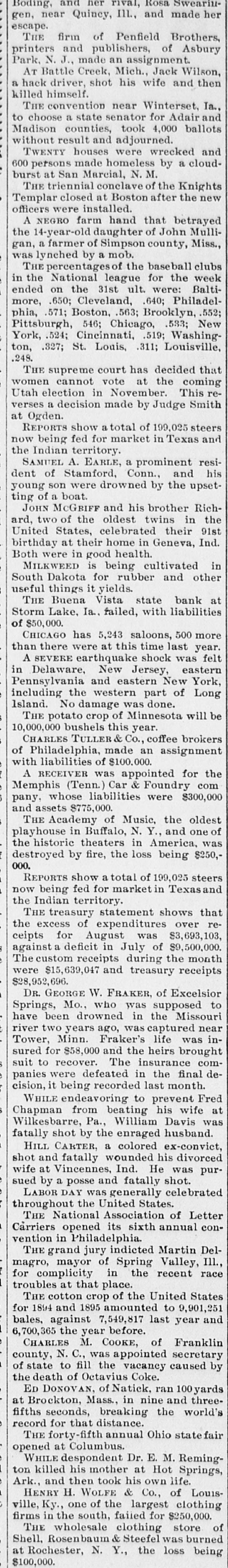 Boding, and her rival, Rosa Swearingen, near Quincy, III., and made her escape. THE firm of Penfield Brothers, printers and publishers, of Asbury Park, N.J., made an assignment. AT Battle Creek, Mich., Jack Wilson, a hack driver, shot his wife and then killed himself. THE convention near Winterset, Ia., to choose a state senator for Adair and Madison counties, took 4,000 ballots without result and adjourned. TWENTY houses were wrecked and 600 persons made homeless by a cloudburst at San Marcial, N.M. THE triennial conclave of the Knights Templar closed at Boston after the new officers were installed. A NEGRO farm hand that betrayed of a farmer of Simpson county, gan, the 14-year-old daughter mob. John Mulli- Miss., was lynched by a THE percentages of the baseball clubs in the National league for the week ended on the 31st ult. were: Baltimore, .650; Cleveland, .640; Philadelphia, .571; Boston, .563; Brooklyn, .552; Pittsburgh, 546; Chicago, .583; New York, .524; Cincinnati, .519; Washington, .327; St. Louis, .311; Louisville, .248. THE supreme court has decided that women cannot vote at the coming Utah election in November. This reverses a decision made by Judge Smith at Ogden. REPORTS show a total of 199,025 steers now being fed for market in Texas and the Indian territory. A. a resident Conn., SAMUEL of Stamford, EARLE, prominent and his young son were drowned by the upsetting of a boat. JOHN McGRIFF and his brother Richard, two of the oldest twins in the United States, celebrated their 91st birthday at their home in Geneva, Ind. Both were in good health. MILKWEED is being cultivated in South Dakota for rubber and other useful things it vields. THE Buena Vista state bank at Storm Lake, Ia. failed, with liabilities of $50,000. CHICAGO has 5,243 saloons, 500 more than there were at this time last year. A SEVERE earthquake shock was felt in Delaware, New Jersey, eastern Pennsylvania and eastern New York, including the western part of Long Island. No damage was done. THE potato crop of Minnesota will 10,000,000 bushels this year. CHARLES TULLER & Co., coffee brokers of Philadelphia, made an assignment with liabilities of $100,000. A RECEIVER was appointed for the Memphis (Tenn.) Car & Foundry com pany, whose liabilities were $300,000 and assets $775,000. THE Academy of Music, the oldest playhouse in Buffalo, N. Y., and one of the theaters in was historic America, being $250,destroyed by fire, the loss 000. REPORTS show a total of 199,025 steers now being fed for market in Texas and the Indian territory. THE treasury statement shows that the excess of expenditures over receipts for August was $3,693,103, against a deficit in July of $9,500,000. The custom receipts during the month were $15,639,047 and treasury receipts $28,952,696. W. FRAKER, of Excelsior Mo., who was Springs, DR. GEORGE supposed Missouri to been drowned in the two ago, was near Minn. Fraker's was river have Tower, years captured life in$58,000 and the heirs brought recover. The comwere defeated in the sured suit panies to for insurance last month. final decision, it being recorded WHILE endeavoring to prevent Fred from beating his wife at Pa., William was shot by the enraged fatally Wilkesbarre, Chapman husband. ex-convict, Davis CARTER, a colored and wounded wife at Ind. was shot HILL Vincennes, fatally He his divorced pursued by a posse and fatally shot. LABOR DAY was generally celebrated throughout the United States. THE National Association of Letter Carriers opened its sixth annual convention in Philadelphia. jury indicted of Spring magro, THE grand mayor recent Martin Valley, race Del- Ill., for complicity in the troubles at that place. THE cotton crop of the United States for 1894 and 1895 amounted to 9,901,251 bales, against 7,549,817 last year and 6,700,365 the year before. M. COOKE, of Franklin N. C., was appointed county, CHARLES caused secretary by of state to fill the vacancy the death of Octavius Coke. ED DONOVAN, of Natick, ran 00 yards Brockton, Mass., in nine and threeat fifths seconds, breaking the world's record for that distance. THE forty-fifth annual Ohio state fair opened at Columbus. despondent Dr. E. M. Reminghis mother at ton WHILE killed Hot life. Springs, Ark., and then took his own HENRY H. WOLFE & Co., of Louisville, Ky., one of the largest clothing firms in the south, failed for $250,000. of THE wholesale clothing store Shell, Rosenba & Steefel was burned at Rochester, N. Y., the loss being $100,000.