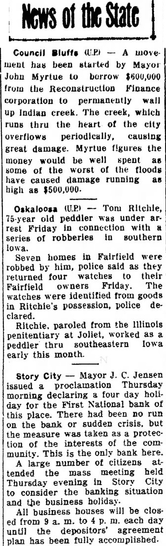 News of the State Council Bluffs (U.P.) A move ment has been started by Mayor John Myrtue to borrow $600,000 from the Reconstruction Finance corporation to permanently wall up Indian creek. The creek, which runs thru the heart of the city overflows periodically, causing great damage. Myrtue figures the money would be well spent some of the worst of the floods have caused damage running as high as $500,000. Oskaloosa (U.P.) Tom Ritchle, 75-year old peddler was under arrest Friday in connection with a series of robberies in southern lowa. Seven homes in Fairfield were robbed by him, police said as they returned four watches to their Fairfield owners Friday. The watches were identified from goods in Ritchie's possession, police declared. Ritchie. paroled from the Illinois penitentiary at Joliet, worked as peddler thru southeastern Iowa early this month. Story City Mayor J. C. Jensen issued a proclamation Thursday morning declaring four day holiday for the First National bank of this place. There had been no run on the bank or sudden crisis. but the measure was taken as protection of the interests of the community. This is the only bank here. large number of citizens attended the mass meeting held Thursday evening in Story City to consider the banking situation and the business holiday. All business houses will be closed from a. m. to m. each day until the depositors' agreement plan has been fully accomplished.