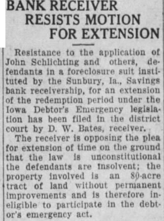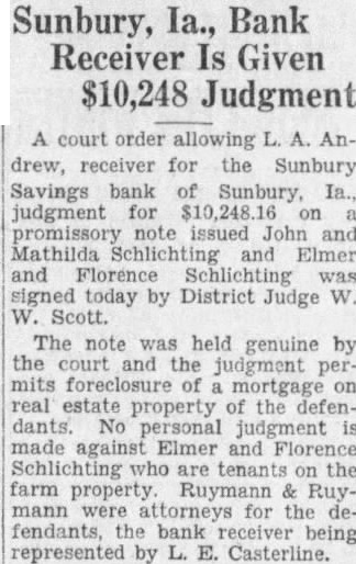 Sunbury, Ia., Bank Receiver Is Given $10,248 Judgment A court order allowing L. A. Andrew, receiver for the Sunbury Savings bank of Sunbury, Ia., judgment for $10,248.16 on promissory note issued John and Mathilda Schlichting and Elmer and Florence Schlichting was signed today by District Judge W. W. Scott. The note was held genuine by the court and the judgment permits foreclosure of a mortgage on real estate property of the defendants. No personal judgment is made against Elmer and Florence Schlichting who are tenants on the farm property. Ruymann & Ruymann were attorneys for the defendants, the bank receiver being represented by L. E. Casterline.