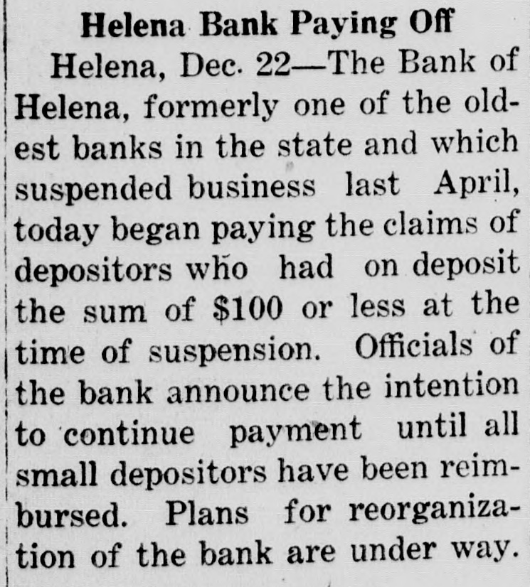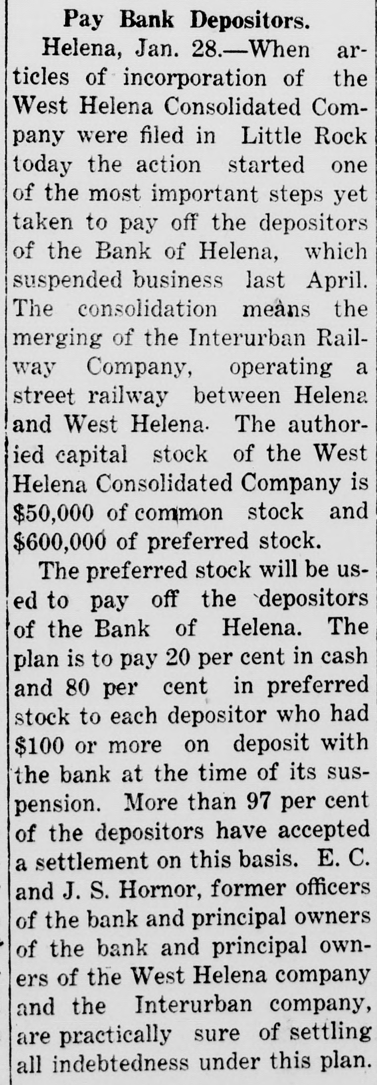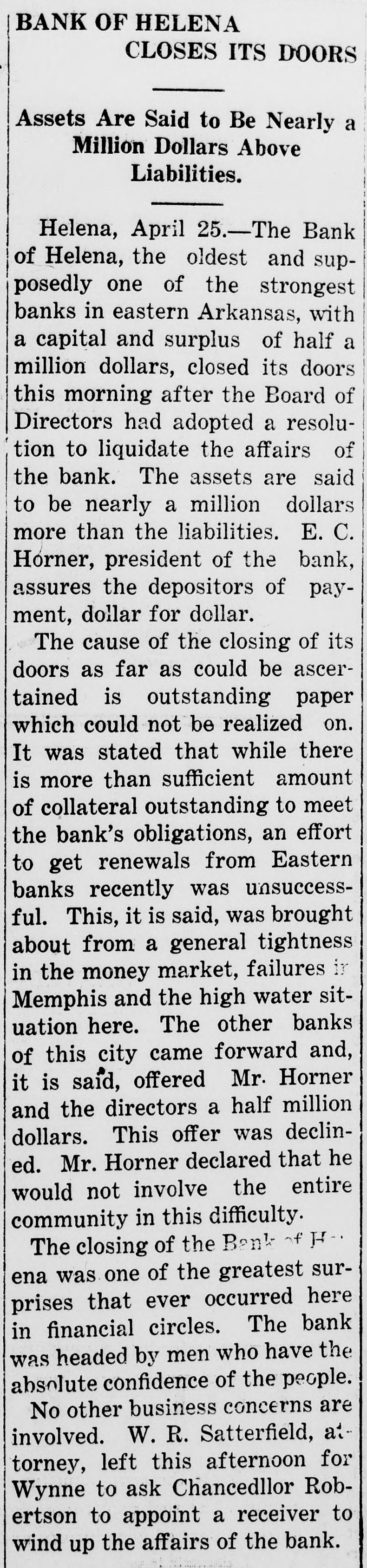 BANK OF HELENA CLOSES ITS DOORS Assets Are Said to Be Nearly a Million Dollars Above Liabilities. Helena, April 25.-The Bank of Helena, the oldest and supposedly one of the strongest banks in eastern Arkansas, with a capital and surplus of half a million dollars, closed its doors this morning after the Board of Directors had adopted a resolution to liquidate the affairs of the bank. The assets are said to be nearly a million dollars more than the liabilities. E. C. Horner, president of the bank, assures the depositors of payment, dollar for dollar. The cause of the closing of its doors as far as could be ascertained is outstanding paper which could not be realized on. It was stated that while there is more than sufficient amount of collateral outstanding to meet the bank's obligations, an effort to get renewals from Eastern banks recently was unsuccessful. This, it is said, was brought about from a general tightness in the money market, failures ir Memphis and the high water situation here. The other banks of this city came forward and, it is said, offered Mr. Horner and the directors a half million dollars. This offer was declined. Mr. Horner declared that he would not involve the entire community in this difficulty. The closing of the Bank H-. ena was one of the greatest surprises that ever occurred here in financial circles. The bank was headed by men who have the absolute confidence of the people. No other business concerns are involved. W. R. Satterfield, attorney, left this afternoon for Wynne to ask Chancedllor Robertson to appoint a receiver to wind up the affairs of the bank.