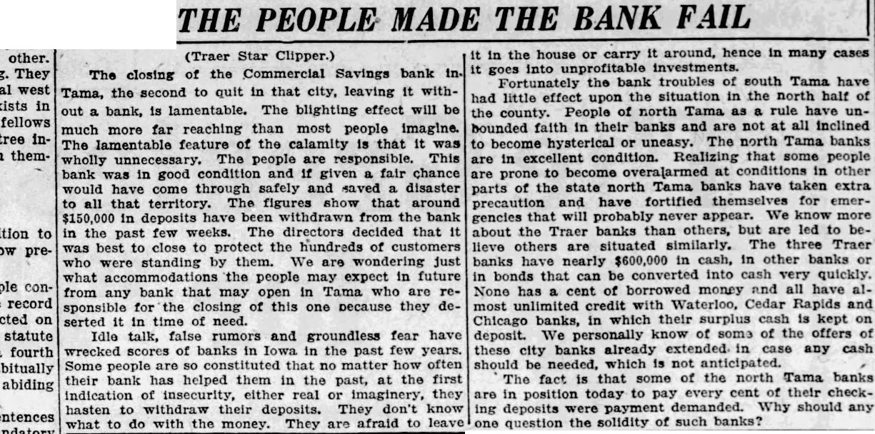 PEOPLE MADE THE BANK FAIL THE (Traer Star Clipper.) The closing of the Commercial Savings bank Tama, the second to quit in that city, leaving without bank, is lamentable. The blighting effect will be much more far reaching than most people imagine. The lamentable feature of the calamity that it wholly unnecessary. The people are responsible. This bank in good fair chance would have come through safely saved disaster that territory. figures that around in deposits withdrawn from bank in the The directors that best close protect the hundreds of standing them. wondering just the people expect in future from bank that open Tama who are sponsible for closing of this one because they serted time need. Idle talk, rumors and groundless fear have wrecked scores of banks in Iowa the past few years. Some people constituted that matter their bank has helped them in the past, the first indication insecurity, either imaginery, they hasten withdraw their deposits. They don't to do with money. They afraid to the house carry around, hence in many cases into the bank troubles south Tama had little effect the situation in the half of the Tama rule bounded in their banks and not all inclined The Tama banks to condition. that people are to other Tama have extra parts of precaution have the Traer banks others, are led about lieve others Traer banks nearly $600,000 cash, bonds can converted cash quickly. None cent money all unlimited credit with Cedar and Chicago which their kept know the offers deposit. personally these banks already extended any cash should needed, which not fact that some north Tama banks position today every checkshould any deposits question solidity such banks?