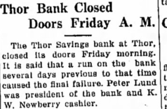 Thor Bank Closed Doors Friday A. The Thor Savings bank Thor, Its doors Friday morning. closed on the bank is said that to that time several days previous final failure. Peter Lund caused the the bank and president of Newberry cashier.