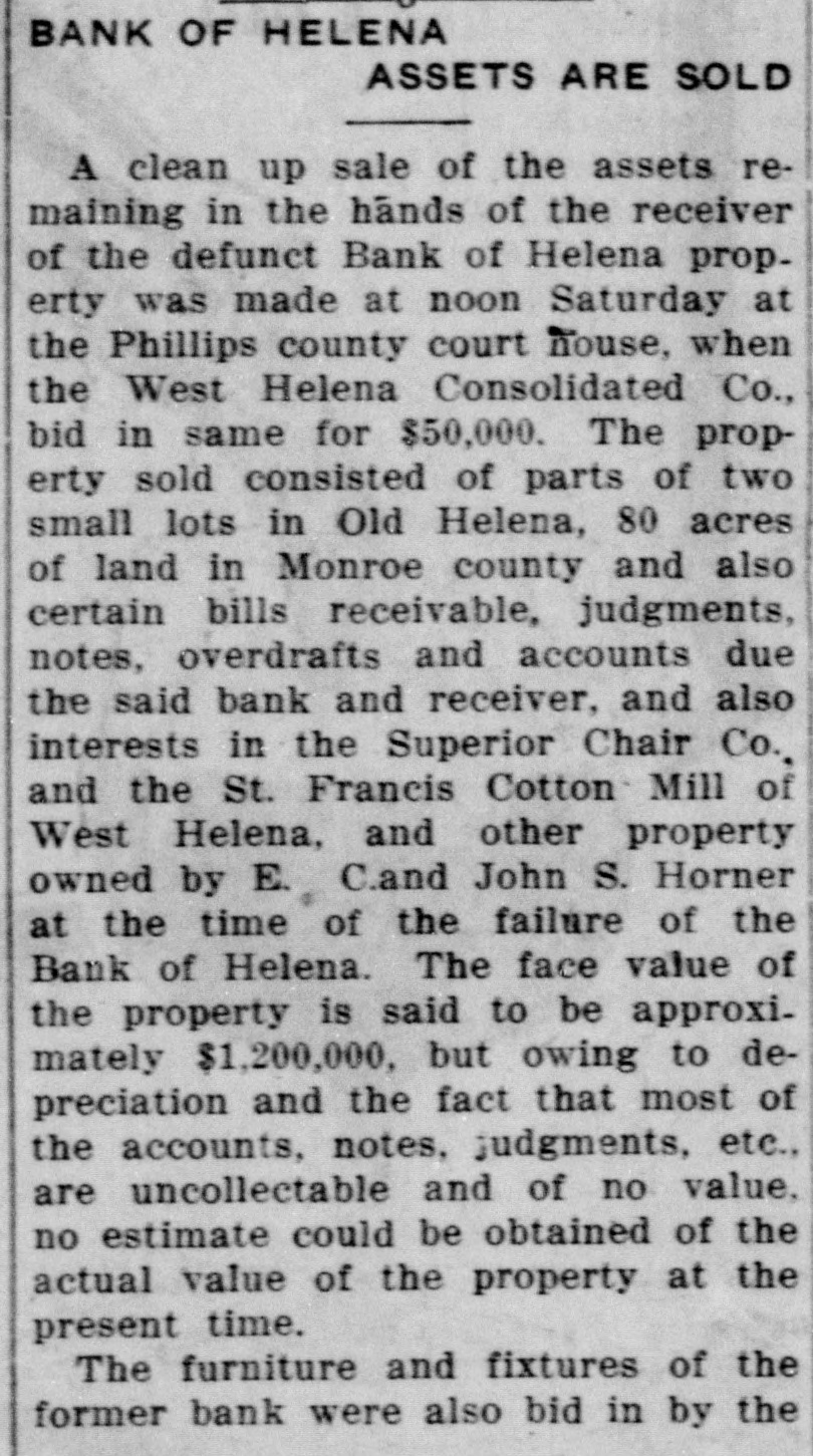 BANK OF HELENA ASSETS ARE SOLD A clean up sale of the assets remaining in the händs of the receiver of the defunct Bank of Helena property was made at noon Saturday at the Phillips county court house, when the West Helena Consolidated Co., bid in same for $50,000. The property sold consisted of parts of two small lots in Old Helena, 80 acres of land in Monroe county and also certain bills receivable, judgments, notes, overdrafts and accounts due the said bank and receiver, and also interests in the Superior Chair Co. and the St. Francis Cotton Mill of West Helena, and other property owned by E. C.and John S. Horner at the time of the failure of the Bank of Helena. The face value of the property is said to be approximately $1,200,000. but owing to depreciation and the fact that most of the accounts, notes, judgments, etc., are uncollectable and of no value. no estimate could be obtained of the actual value of the property at the present time. The furniture and fixtures of the former bank were also bid in by the