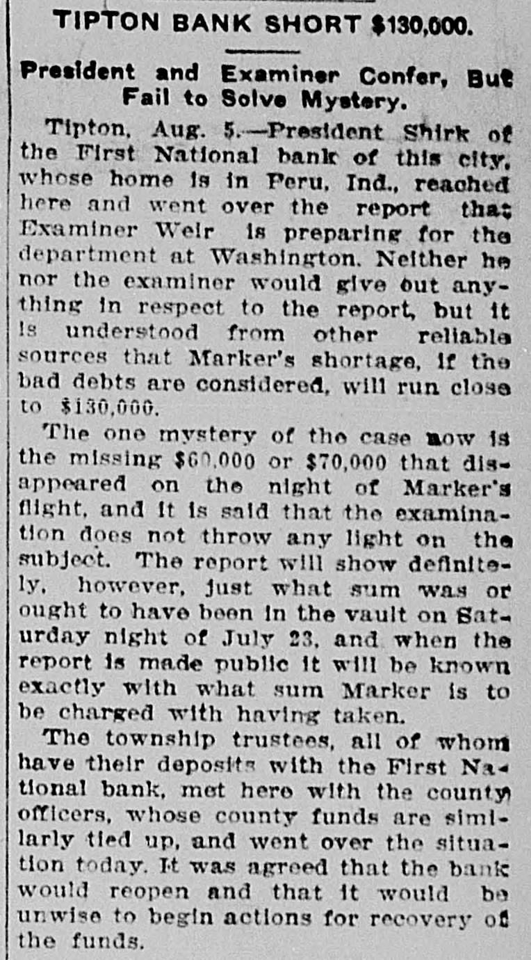 TIPTON BANK SHORT $130,000. President and Examiner Confer, But Fail to Solve Mystery. Tipton, Aug. 5.-President Shirk of the First National bank of this city. whose home is in Peru, Ind., reached here and went over the report that Examiner Weir is preparing for the department at Washington. Neither he nor the examiner would give out anything in respect to the report, but it Is understood from other reliable sources that Marker's shortage, If the bad debts are considered, will run close to $130,000. The one mystery of the case now is the missing $60,000 or $70,000 that disappeared on the night of Marker's flight, and It is said that the examination does not throw any light on the subject. The report will show definitely, however, just what sum was or ought to have been in the vault on Saturday night of July 23, and when the report is made public it will be known exactly with what sum Marker is to be charged with having taken. The township trustees, all of whom have their deposits with the First National bank, met here with the county officers, whose county funds are simllarly tied up, and went over the situation today. It was agreed that the bank would reopen and that it would be unwise to begin actions for recovery of the funds.