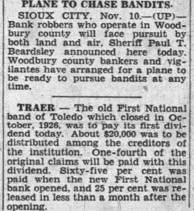 PLANE TO CHASE BANDITS. SIOUX CITY, Nov. 10. (UP) Bank robbers who operate in Woodbury county will face pursuit by both land and air, Paul T. Beardsley announced here today. Woodbury county bankers and vigilantes have arranged for plane to be ready to pursue bandits at any time. TRAER The old First National band Toledo which closed in October, 1926, to pay its first dividend today. About $20,000 was to be distributed among the creditors of the institution. One-fourth of the original claims will be paid with this dividend. Sixty-five per cent was paid when the First National bank opened, and 25 per cent was released in less than month after the opening.