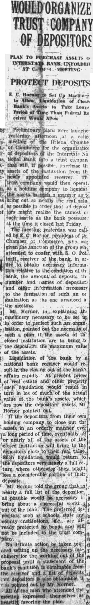 TRUST COMPANY OF DEPOSITORS PLAN TO PURCHASE ASSETS 0 BANK. UNFOLDED AT MEETING PROTECT DEPOSITS E. C. Hornor Set Up Machiner to Allow Liquidation of Closé Bank's Assets to Take Longe Period of Time Than Federal Re ceiver Would Allow were launcher yesterday afternoon at calle meeting of the Chambe of Commerce for the organizatio: of depositors at the Interstate Na tional Bank into a trust compan that will, if possible purchase th assets of the institution from th newly appointed receiver. Th trust company would then operat. as a holding company to liquidat bring out as nearly the real value as possible in order that all deposi tors might realize the utmost or such assets as the bank possessed at the time it closed last Friday The meeting yesterday was callHornor president of the Chamber of Commerce, who wa: given the sanction of the group attended to confer with Pot. torff. receiver of the bank, in or der to obtain necessary informa tion relative to the condition of th bank, the amount of deposits, th number and names of depositor and other information necessary to the formation of such an or ganization as he one proposed a the meeting. Mr. Hornor, in explaining th machinery necessary to be set up In order to perfect such an organ ization, pointed out the necessity of such a plan if the assets of th closed institution are to bring to the the maximum value of the assets. Liquidation of bank by national bank receiver would sult in the closing out of the bank's affairs rapidly At present prices of real estate and other property such liquidation would result in turn in los of much of the actual value of the bank's assets, which are now the depositors' assets, Mr Hornor pointed out. If the depositors from their own holding company to close out the assets in an orderly manner over long period of time, eventually all nearly all of the assets of the closed institution will bring to the depositors close to their real value. Such liquidation. would return to the depositors full re turn where otherwise they might lose a portion of their deposits. Mr. Hornor told the group that nearly a full list of the depositor: as possible would be necessary bring about a successful working out of the plan. The preferred such schools, state and positors, as county are by bonds and will ready protected not be the trust company No definite action be taken tow chinery for statement of the until proposal bank's condition is obtainable from and of deposits receiver depositors is also out by Mr Hornor. pointed who attended the All the men themselves as meeting expressed favoring the plan.