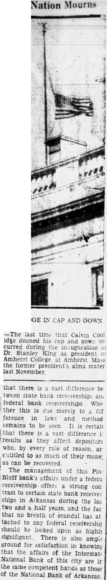 Nation Mourns The last time that Calvin Cool idge dooned his cap and gown DC curred during the inauguration OF Dr Stanley King as president 01 Amherst College at Amherst Mass the former president's alma mater last November that there is a vast difference be tween state bank receivership: an federal bank receiverships Whe ther this is due merely to a dif ference in laws and method remains to be seen It is certain that there is a vast difference i: results as they affect depositors who. by every rule of reason, ar entitled to as much of their mone: as can be recovered. The management of this Pin Bluff bank's affairs under a federa receivership offers a strong con trast to certain state bank receiver ships in Arkansas during the las two and a half years, and the fac that no breath of scandal has at tached to any federal receivership should be looked upon as highly significant. There is also ample ground for satisfaction in knowing that the affairs of the Interstat National Bank of this city are in the same competent hands as those of the National Bank of Arkansas.
