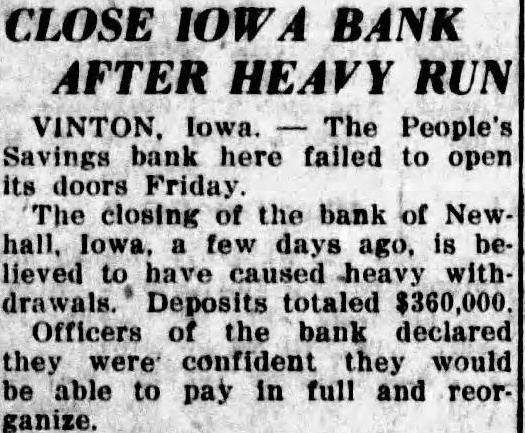 CLOSE IOWA BANK AFTER HEAVY RUN VINTON, Iowa. The People's Savings bank here failed to open its doors Friday. The closing of the bank of Newhall, Iowa, few days ago, is believed to have caused heavy withdrawals. Deposits totaled $360,000 Officers of the bank declared they were confident they would be able to pay in full and reorganize.