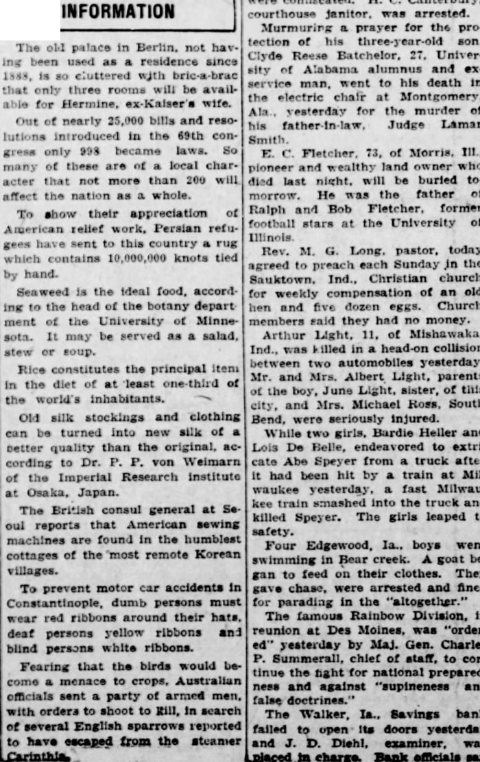 INFORMATION tection of his three-year-old son. The old palace in Berlin. not hav. Clyde Reese Batchelor, 27. Univering been used as a residence since sity of Alabama alumnus and ex1888, is 80 cluttered with bric-a-brac service man, went to his death in that only three rooms will be availthe electric chair at Montgomery, able for Hermine, ex-Kaiser's wife. Ala., yesterday for the murder of Out of nearly 25,000 bills and resohis father-in-law, Judge Lamar lutions introduced in the 69th conSmith. gress only 998 became laws. So E. C. Fletcher, 73, of Morris, III., many of these are of local char- pioneer and land owner acter that not more than 200 will died last night. will be buried to. affect the nation as whole. morrow. He was the father of
