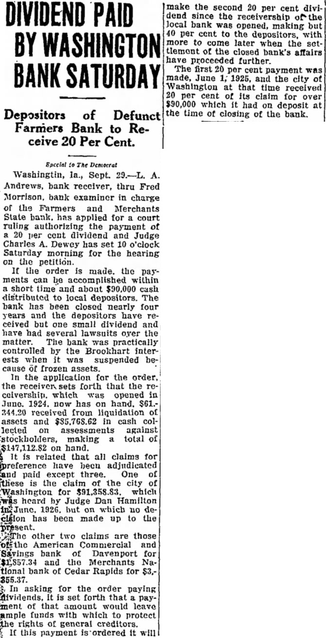 DIVIDEND PAID BY WASHINGTON BANK SATURDAY Depositors of Defunct Farmers Bank to Receive 20 Per Cent. Washingtin, la., Sept. 29.-L. A. Andrews, bank receiver, thru Fred Morrison. bank examiner in charge of the Farmers and Merchants State bank. has applied for court ruling authorizing the payment of 20 per cent dividend and Judge Charles A. Dewey has set 10 o'clock Saturday morning for the hearing on the petition. If the order is made. the payments can be accomplished within a short time and about $90,000 cash distributed to local depositors. The bank has been closed nearly four years and the depositors have received but one small dividend and have had several lawsuits over the matter. The bank was practically controlled by the Brookhart interests when it was suspended because of frozen assets. In the application for the order. the receiver sets forth that the receivership. which was opened in June. 1924. now has on hand. $61.344.20 received from liquidation of assets and $85,768.62 in cash collected on assessments against Estockholders, making a total of $147,112.82 on hand. It is related that all claims for preference have been adjudicated and paid except three. One of these is the claim of the city of Washington for $91,358.83. which was heard by Judge Dan Hamilton June. 1926. but on which no decision has been made up to the present. other two claims are those the American Commercial and Savings bank of Davenport for $1,857.34 and the Merchants National bank of Cedar Rapids for $3,355.37. In asking for the order paying dividends, It is set forth that payment of that amount would leave Sample funds with which to protect rights of general creditors. If this payment is ordered it will make the second 20 per cent dividend since the receivership of the local bank was opened, making but 40 per cent to the depositors, with more to come later when the settlement of the closed bank's affairs have proceeded further. The first 20 per cent payment was made, June 1, 1925, and the city of Washington at that time received 20 per cent of its claim for over $90,000 which it had on deposit at the time of closing of the bank.