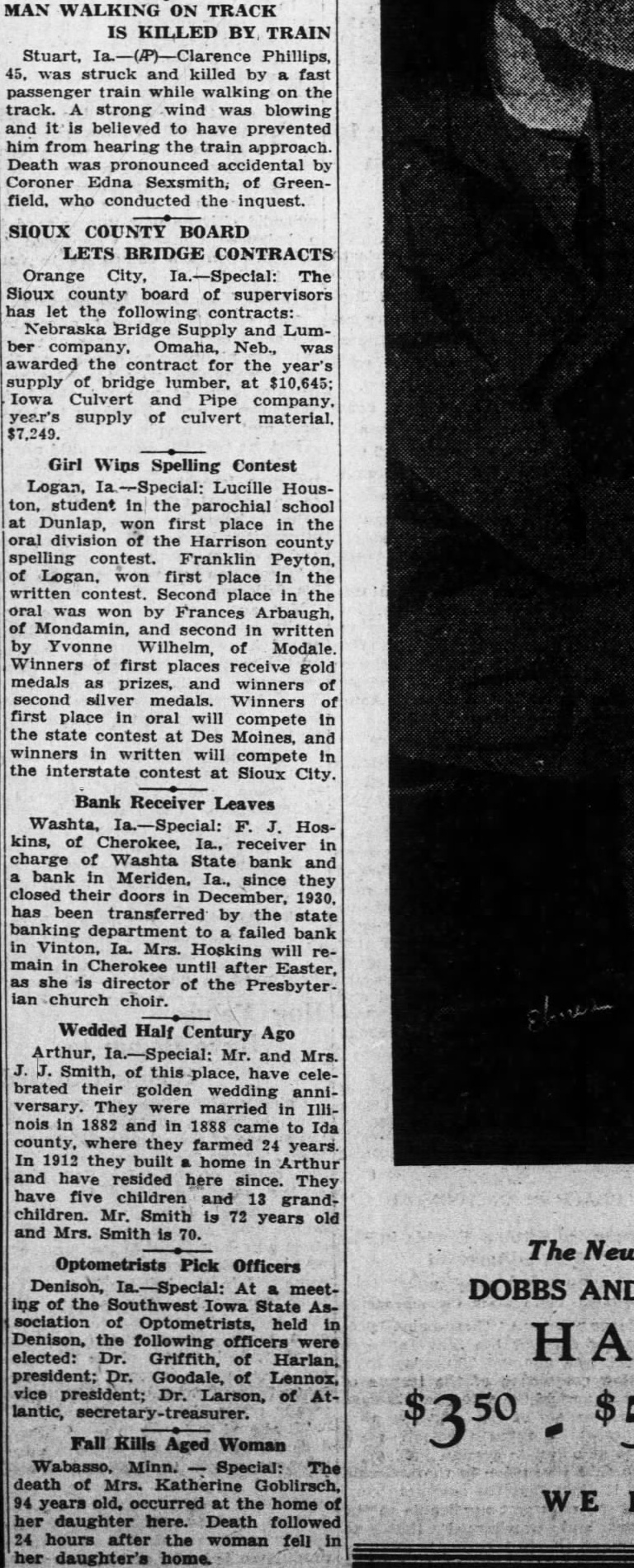 Logan, Ia --Special: Lucille Houston, student in the parochial school at Dunlap, won first place in the oral division of the Harrison county spelling contest. Franklin Peyton, of Logan, won first place in the written contest. Second place in the oral was won by Frances Arbaugh, of Mondamin, and second in written by Yvonne Wilhelm, of Modale. Winners of first places receive gold medals as prizes, and winners of second silver medals. Winners of first place in oral will compete in the state contest at Des Moines, and winners in written will compete in the interstate contest at Sioux City.