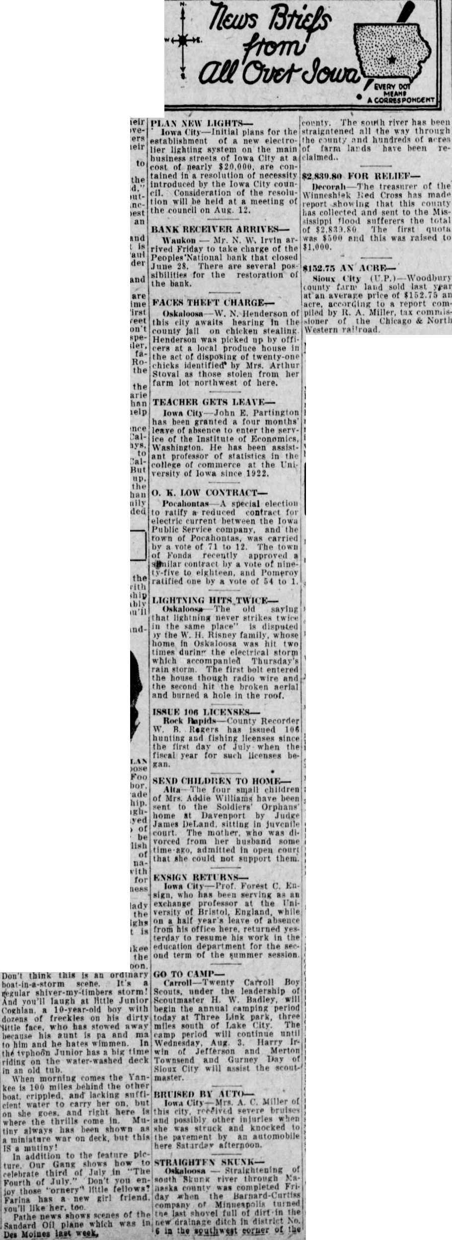 GO TO CAMPCarroll Boy Scouts, under the leadership will Scoutmaster begin the annual camping period today at Three Link three miles south Lake City. The camp period will Harry until Wednesday Merton and Gurney Day Sloux City will assist the scoutin When comes the Yan- master. 100 miles behind the other suffiand BRUISED BY AUTOboat. lacking Miller of water to carry her on. but cient right here this received severe on she and possibly other injuries where the come she was and knocked always has been miniature war on deck, but this the automobile IS mutiny! In addition to the feature picGang shows how STRAIGHTEN Straightening of third July in Oskaloosa celebrate en- south Skunk river through Fourth of July Don't you fellows? county completed those "ornery" little friend day when the Farina girl of news in district Sandard the