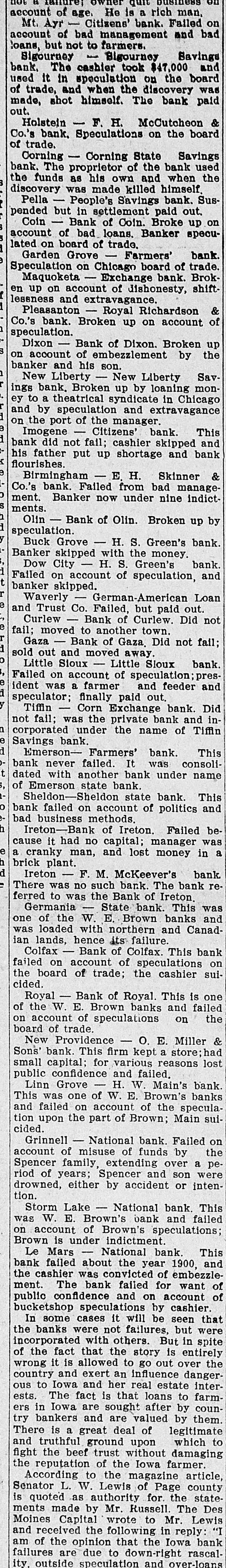 account of age. He is a rich man. Mt. Ayr - Citizens' bank. Failed on account of bad management and bad loans, but not to farmers. Sigourney - Sigourney Savings bank. The cashier took $47,000 and used it in speculation on the board of trade, and when the discovery was made, shot himself. The bank paid out. Holstein - F. H. McCutcheon & Co.'s bank, Speculations on the board of trade. Corning - Corning State Savings bank. The proprietor of the bank used the funds as his own and when the discovery was made killed himself. Pella - People's Savings bank. Suspended but in settlement paid out. Coin - Bank of Coin. Broke up on account of bad loans, Banker speculated on board of trade. Garden Grove - Farmers' bank. Speculation on Chicago board of trade. Maquoketa - Exchange bank. Broken up on account of dishonesty, shiftlessness and extravagance. Pleasanton - Royal Richardson & Co.'s bank. Broken up on account of speculation. Dixon - Bank of Dixon. Broken up on account of embezzlement by the banker and his son. New Liberty - New Liberty Savings bank, Broken up by loaning money to a theatrical syndicate in Chicago and by speculation and extravagance on the port of the manager. Imogene - Citizens' bank. This bank did not fail; cashier skipped and his father put up shortage and bank flourishes. Birmingham - E. H. Skinner & Co.'s bank. Failed from bad management. Banker now under nine indictments. Olin - Bank of Olin. Broken up by speculation. Buck Grove - H. S. Green's bank. Banker skipped with the money. Dow City - H. S. Green's bank. Failed on account of speculation, and banker skipped. Waverly - German-American Loan and Trust Co. Failed, but paid out. Curlew - Bank of Curlew. Did not fail; moved to another town. Gaza - Bank of Gaza, Did not fail; sold out and moved away. Little Sioux - Little Sioux bank. Failed on account of speculation; president was a farmer and feeder and speculator; finally paid out. Tiffin - Corn Exchange bank. Did not fail; was the private bank and incorporated under the name of Tiffin Savings bank. Emerson - Farmers' bank. This bank never failed. It was consolidated with another bank under name of Emerson state bank. Sheldon - Sheldon state bank. This bank failed on account of politics and bad business methods. Ireton - Bank of Ireton. Failed because it had no capital; manager was a cranky man, and lost money in a brick plant. Ireton - F. M. McKeever's bank. There was no such bank. The bank referred to was the Bank of Ireton. Germania - State bank. This was one of the W. E. Brown banks and was loaded with northern and Canadian lands, hence its failure. Colfax - Bank of Colfax. This bank failed on account of speculations on the board of trade; the cashier suicided. Royal - Bank of Royal. This is one of the W. E. Brown banks and failed on account of speculations on the board of trade. New Providence - O. E. Miller & Sons' bank. This firm kept a store; had small capital; for various reasons lost public confidence and failed. Linn Grove - H. W. Main's bank. This was one of W. E. Brown's banks and failed on account of the speculation upon the part of Brown; Main suicided. Grinnell - National bank. Failed on account of misuse of funds by the Spencer family, extending over a period of years; Spencer and son were drowned, either by accident or intention. Storm Lake - National bank. This was W. E. Brown's bank and failed on account of Brown's speculations; Brown is under indictment. Le Mars - National bank. This bank failed about the year 1900, and the cashier was convicted of embezzlement. The bank failed for want of public confidence and on account of bucketshop speculations by cashier. In some cases it will be seen that the banks were not failures, but were incorporated with others. But in spite of the fact that the story is entirely wrong it is allowed to go out over the country and exert an influence dangerous to Iowa and her real estate interests. The fact is that loans to farmers in Iowa are sought after by country bankers and are valued by them. There is a great deal of legitimate and truthful ground upon which to fight the beef trust without damaging the reputation of the Iowa farmer. According to the magazine article, Senator L. W. Lewis of Page county is quoted as authority for the statements made by Mr. Russell. The Des Moines Capital wrote to Mr. Lewis and received the following in reply: "I am of the opinion that the Iowa bank failures are due to down-right rascality, outside speculation and over-loans.