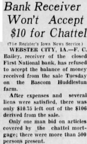 Register's WEBSTER CITY, Bailey, receiver of the closed First National bank, has refused to accept the balance of money received from the Tuesday the Bascom Huddlestun farm. After expenses and several liens were satisfied. there was only left out of the $106 derived from the sale. Only one bid on articles covered by the chattel mortgage; there more than 500 persons present.