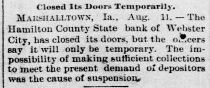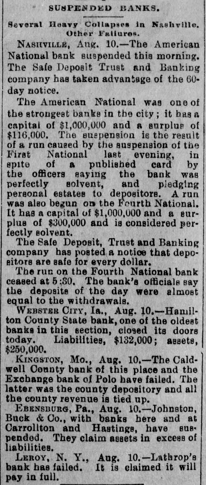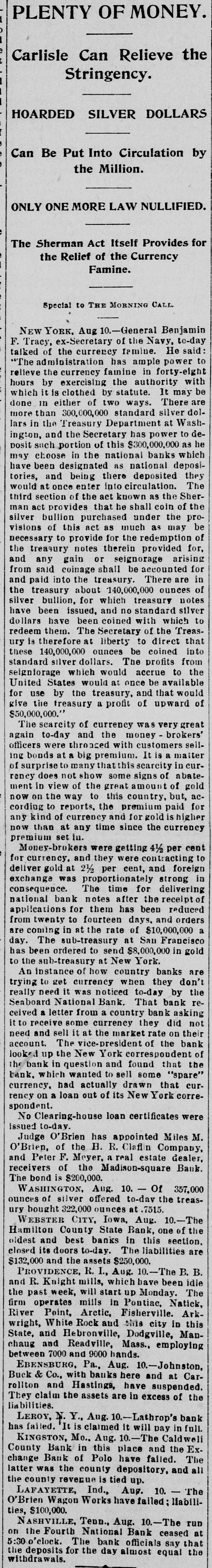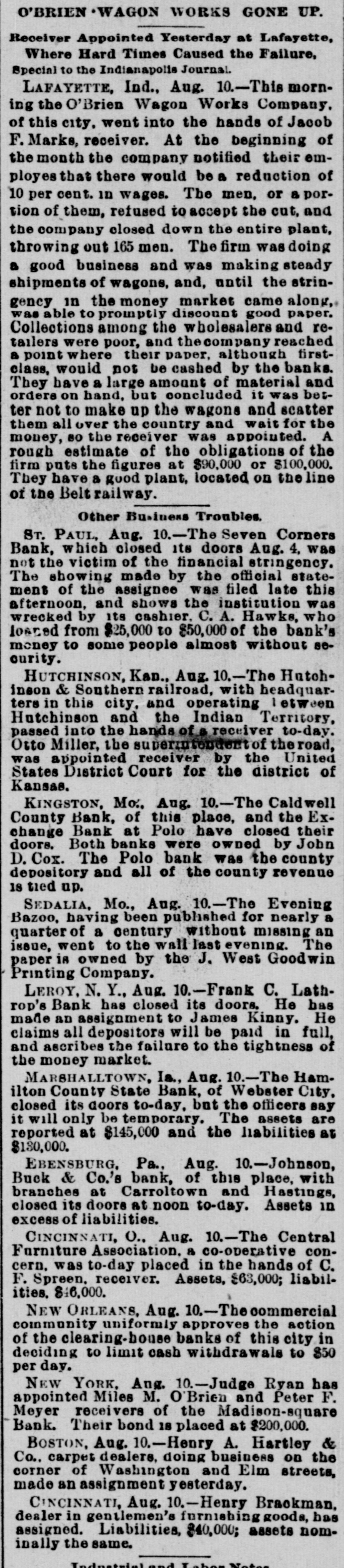 O'BRIEN *WAGON WORKS GONE UP. Receiver Appointed Yesterday at Lafayette, Where Hard Times Caused the Failure, Special to the Indianapolis Journal LAFAYETTE, Ind., Aug. 10.-This morning the O'Brien Wagon Works Company. of this city. went into the hands of Jacob Marks, receiver. At the beginning of the month the company notified their employes that there would be a reduction of 10 per cent. in wages. The men, or a portion of them, refused to accept the cut, and the company closed down the entire plant, throwing out 165 men. The firm was doing a good business and was making steady shipments of wagone, and, until the stringency in the money market came along, was able to promptly discount good paper. Collections among the wholesalers and retailers were poor, and the company reached a point where their paper, although firstclass, would not be cashed by the banks. They have a large amount of material and orders on hand, but concluded it was better not to make up the wagons and scatter them all over the country and wait for the money, 80 the receiver was appointed. A rough estimate of the obligations of the firm puts the figures at $90,000 or $100,000. They have a good plant, located on the line of the Beltrailway. Other Business Troubles. ST. PAUL, Aug. 10.-The Seven Corners Bank, which closed its doors Aug. 4, was not the victim of the financial stringency. The showing made by the official statement of the assignee was filed late this afternoon, and shows the institution was wrecked by its cashier. C. A. Hawks, who lossed from $25,000 to $50,000 of the bank's money to some people almost without security. HUTCHINSON, Kan., Aug. 10.-The Hutchinson & Southern railroad, with headquarters in this city, and operating letween Hatchinson and the Indian Territory, passed into the hands of a receiver to-day. Otto Miller, the superintendent of theroad, was appointed receiver by the United States District Court for the district of Kansas. KINGSTON, Mo., Aug. 10.-The Caldwell County Bank, of this place, and the Exchange Bank at Polo have closed their doors. Both banks were owned by John D. Cox. The Polo bank was the county depository and all of the county revenue 18 tied up. SEDALIA, Mo., Aug. 10.-The Evening Bazoo, having been published for nearly a quarter of a century without missing an issue, went to the wall last evening. The paper is owned by the J. West Goodwin Printing Company. LEROY, N. Y., Aug. 10.-Frank C. Lathrop's Bank has closed its doors. He has made an assignment to James Kinny. He claims all depositors will be paid in full, and ascribes the failure to the tightness of the money market. MARSHALLTOWN, Ia., Aug. 10.-The Hamilton County State Bank, of Webster City, closed its doors to-day. bnt the officers say it will only be temporary. The assets are reported at $145,000 and the liabilities at $130,000. EBENSBURG, Pa., Aug. 10.-Johnson, Buck & Co.'s bank, of this place, with branches at Carroltown and Hastings, closed its doors at noon to-day. Assets in excess of liabilities. CINCINNATI, O., Aug. 10.-The Central Forniture Association. a co-operative concern. was to-day placed in the hands of C. F. Spreen. receiver. Assets, $63,000; liabilities. 84,000. NEW ORLEANS, Aug. 10.-Thecommercial community uniformly approves the action of the clearing-house banks of this city in deciding to limit cash withdrawals to $50 per day. NEW YORK, Ang. 10.-Judge Ryan has appointed Miles M. O'Brien and Peter F. Meyer receivers of the Madison-square Bank. Their bond 18 placed at $200,000. BOSTON, Aug. 10.-Henry A. Hartley & Co., carpet dealers, doing business on the corner of Washington and Elm streets, made an assignment yesterday. CINCINNATI, Aug. 10.-Henry Brackman. dealer in gentlemen's furnishing goods, has assigned. Liabilities, $40,000; assets nominally the same.