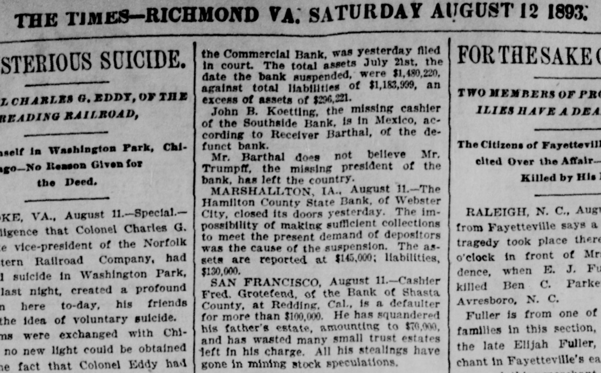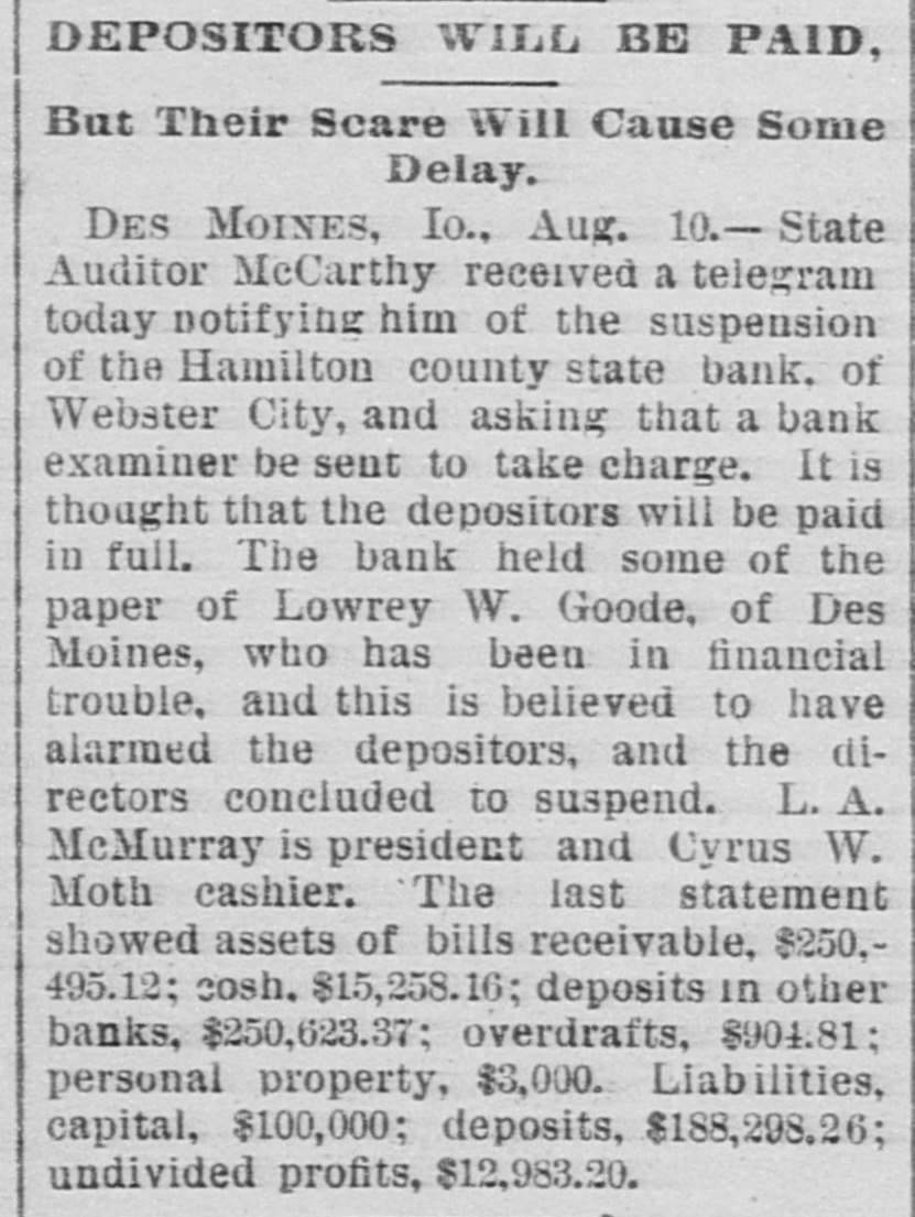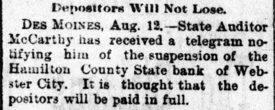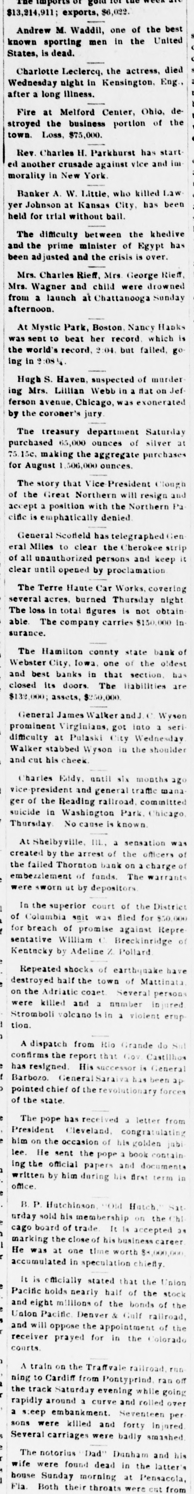 O'BRIEN *WAGON WORKS GONE UP. Receiver Appointed Yesterday at Lafayette, Where Hard Times Caused the Failure, Special to the Indianapolis Journal LAFAYETTE, Ind., Aug. 10.-This morning the O'Brien Wagon Works Company. of this city. went into the hands of Jacob Marks, receiver. At the beginning of the month the company notified their employes that there would be a reduction of 10 per cent. in wages. The men, or a portion of them, refused to accept the cut, and the company closed down the entire plant, throwing out 165 men. The firm was doing a good business and was making steady shipments of wagone, and, until the stringency in the money market came along, was able to promptly discount good paper. Collections among the wholesalers and retailers were poor, and the company reached a point where their paper, although firstclass, would not be cashed by the banks. They have a large amount of material and orders on hand, but concluded it was better not to make up the wagons and scatter them all over the country and wait for the money, 80 the receiver was appointed. A rough estimate of the obligations of the firm puts the figures at $90,000 or $100,000. They have a good plant, located on the line of the Beltrailway. Other Business Troubles. ST. PAUL, Aug. 10.-The Seven Corners Bank, which closed its doors Aug. 4, was not the victim of the financial stringency. The showing made by the official statement of the assignee was filed late this afternoon, and shows the institution was wrecked by its cashier. C. A. Hawks, who lossed from $25,000 to $50,000 of the bank's money to some people almost without security. HUTCHINSON, Kan., Aug. 10.-The Hutchinson & Southern railroad, with headquarters in this city, and operating letween Hatchinson and the Indian Territory, passed into the hands of a receiver to-day. Otto Miller, the superintendent of theroad, was appointed receiver by the United States District Court for the district of Kansas. KINGSTON, Mo., Aug. 10.-The Caldwell County Bank, of this place, and the Exchange Bank at Polo have closed their doors. Both banks were owned by John D. Cox. The Polo bank was the county depository and all of the county revenue 18 tied up. SEDALIA, Mo., Aug. 10.-The Evening Bazoo, having been published for nearly a quarter of a century without missing an issue, went to the wall last evening. The paper is owned by the J. West Goodwin Printing Company. LEROY, N. Y., Aug. 10.-Frank C. Lathrop's Bank has closed its doors. He has made an assignment to James Kinny. He claims all depositors will be paid in full, and ascribes the failure to the tightness of the money market. MARSHALLTOWN, Ia., Aug. 10.-The Hamilton County State Bank, of Webster City, closed its doors to-day. bnt the officers say it will only be temporary. The assets are reported at $145,000 and the liabilities at $130,000. EBENSBURG, Pa., Aug. 10.-Johnson, Buck & Co.'s bank, of this place, with branches at Carroltown and Hastings, closed its doors at noon to-day. Assets in excess of liabilities. CINCINNATI, O., Aug. 10.-The Central Forniture Association. a co-operative concern. was to-day placed in the hands of C. F. Spreen. receiver. Assets, $63,000; liabilities. 84,000. NEW ORLEANS, Aug. 10.-Thecommercial community uniformly approves the action of the clearing-house banks of this city in deciding to limit cash withdrawals to $50 per day. NEW YORK, Ang. 10.-Judge Ryan has appointed Miles M. O'Brien and Peter F. Meyer receivers of the Madison-square Bank. Their bond 18 placed at $200,000. BOSTON, Aug. 10.-Henry A. Hartley & Co., carpet dealers, doing business on the corner of Washington and Elm streets, made an assignment yesterday. CINCINNATI, Aug. 10.-Henry Brackman. dealer in gentlemen's furnishing goods, has assigned. Liabilities, $40,000; assets nominally the same.