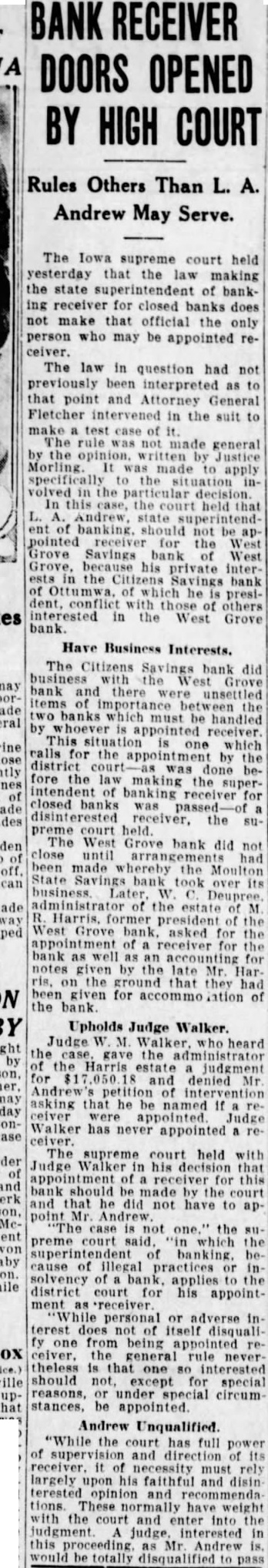 BANK RECEIVER DOORS OPENED BY HIGH COURT Rules Others Than L. A. Andrew May Serve. The Iowa supreme court held yesterday that the law making the state superintendent of banking receiver for closed banks does not make that official the only person who may be appointed receiver. The law in question had not previously been interpreted as to that point and Attorney General Fletcher intervened in the suit to make test case it. The rule was not made general the opinion, written Justice Morling. was made to apply specifically to the situation involved in the particular decision In this court held that Andrew, state superintendent of banking. not be pointed receiver for the West Grove Savings bank of West Grove, because his private interests in the Citizens Savings bank of of he is presiconflict with of others interested in the West Grove bank. Have Business Interests. The Citizens Savings bank did business the Grove bank and there items two of importance the banks which must be handled by This whoever is appointed receiver. situation one which for the by the district done fore the law making the superclosed intendent of banks was disinterested receiver. the supreme court held. The West Grove bank did not close until been made the Moulton State Savings bank took over administrator of the estate of the Grove bank. asked for appointment of receiver for bank as well as an accounting notes given by the late Mr. Harris, the ground that they had been given for accommo intion the bank. Upholds Judge Walker. Judge W. M. Walker. heard the gave the administrator of the Harris estate judgment for and denied Mr Andrew's of asking that he be named If ceiver Judge Walker has never appointed a resupreme court held with Judge Walker in his decision that of receiver for bank should be made by the court and that he did not have to appoint not one the which the of cause of illegal practices or solvency of bank. to the district court for his appointment as personal or adverse in terest does not of itself disquali fy one from being appointed ceiver, the general rule nevertheless is one interested should not except for special reasons, or under circumstances, be appointed. Andrew Unqualified. "While the court has full of and necessity largely upon his faithful and disin terested opinion and recommenda tions. These normally have weight with the court and enter into the judgment. judge, interested this ceeding. as Mr Andrew would be totally disqualified to