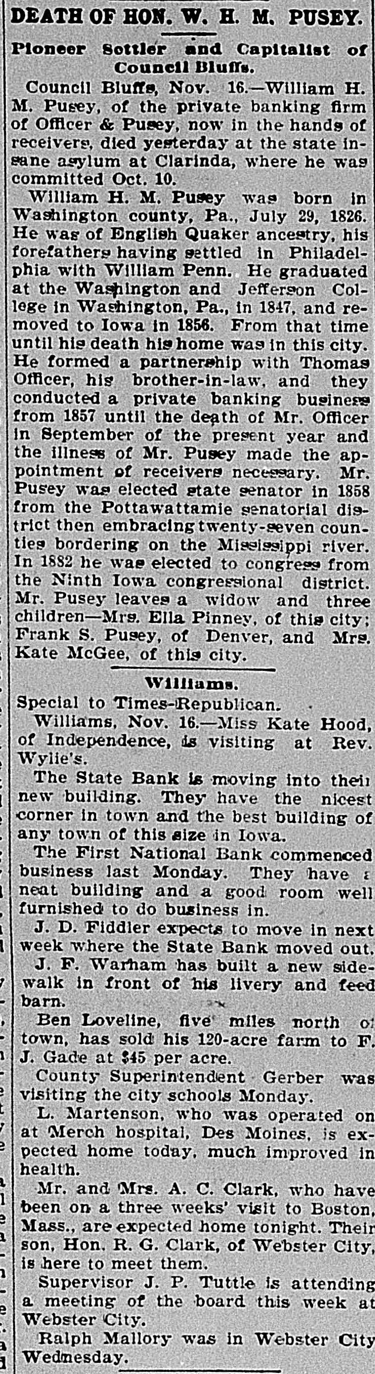 DEATH OF HON. W. H. M. PUSEY. Pioneer Settler and Capitalist of Council Bluffs. Council Bluffs, Nov. 16.-William H. M. Pusey, of the private banking firm of Officer & Pusey, now in the hands of receivers, died yesterday at the state insane asylum at Clarinda, where he was committed Oct. 10. William H. M. Pusey was born in Washington county, Pa., July 29, 1826. He was of English Quaker ancestry, his forefathers having settled in Philadelphia with William Penn. He graduated at the Washington and Jefferson College in Washington, Pa., in 1847, and removed to Iowa in 1856. From that time until his death his home was in this city. He formed a partnership with Thomas Officer, his brother-in-law, and they conducted a private banking business from 1857 until the death of Mr. Officer in September of the present year and the illness of Mr. Pusey made the appointment of receivers necessary. Mr. Pusey was elected state senator in 1858 from the Pottawattamie senatorial district then embracingtwenty-seven counties bordering on the Mississippi river. In 1882 he was elected to congress from the Ninth Iowa congressional district. Mr. Pusey leaves a widow and three children-Mrs. Ella Pinney, of this city; Frank S. Pusey, of Denver, and Mrs. Kate McGee, of this city. Williams. Special to Times-Republican. Williams, Nov. 16.-Miss Kate Hood, of Independence, is visiting at Rev. Wylie's. The State Bank is moving into their new building. They have the nicest corner in town and the best building of any town of this size in Iowa. The First National Bank commenced business last Monday. They have E neat building and a good room well furnished to do business in. J. D. Fiddler expects to move in next week where the State Bank moved out. J. F. Warham has built a new sidewalk in front of his livery and feed barn. Ben Loveline, five miles north of town, has sold his 120-acre farm to F. J. Gade at $45 per acre. County Superintendent Gerber was visiting the city schools Monday. L. Martenson, who was operated on at Merch hospital, Des Moines, is expected home today. much improved in health. Mr. and Mrs. A. C. Clark, who have been on a three weeks' visit to Boston, Mass., are expected home tonight. Their son, Hon. R. G. Clark, of Webster City, is here to meet them. Supervisor J. P. Tuttle is attending a meeting of the board this week at Webster City. Ralph Mallory was in Webster City Wednesday.