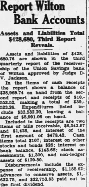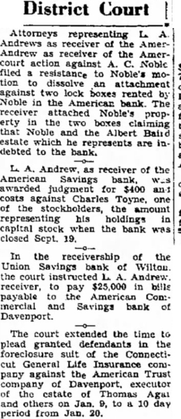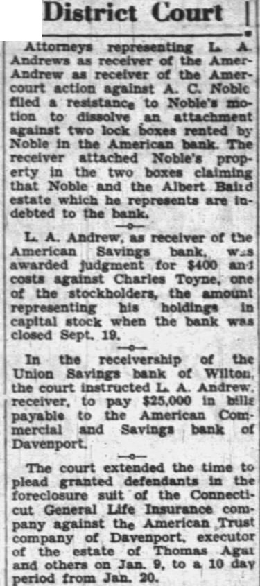 CONFIDENCE BANKING SITUATION REFLECTED AS EXCITEMENT PASSES Hysteria of Yesterday Gives Way Quickly in Rock Island as Public Shows Desire to Preserve Business Structure of Community. RUN ON DAVENPORT BANK BEGINS TO EBB Deere Co. Issues Statement of Confidence in Peoples Savings Bank Trust Company; Moline State Bank Applies Notice Rule. Hysteria and excitement which created turbulent day in quad-city banking history yesterday had disappeared in Rock Island today and was dwindling in Davenport. In Moline the 60-day rule was imposed by the Moline State Trust & Savings bank. Those persons in Davenport who could not be dissuaded from withdráwing their deposits at the Union Savings bank, Davenport, transacted their business to strains of lively music by an orchestra stationed in the bank. Business men, churchmen and civic leaders talked to the crowds and urged a calm view of the situation, and assured skeptical depositors that there was no occasion for alarm. In Rock Island the examination of the Central Trust & Savings bank, occasioned by the voluntary closing yesterday to protect all depositors, was begun under the direction of Jaeger, examiner in charge representing Oscar Nelson, state auditor public accounts. Normal activities in progress at the three other Rock Island banks which yesterday imposed the 60-day notice rule for withdrawal of savings deposits, the Rock Island Savings bank, the State Bank of Rock Island and the Manufacturers Trust & Savings bank. None of the excitement of yesterday was in evidence. Deere Co. Statement. At Peoples Savings Bank Trust company, Moline, persons who entered the banking house handed copy of statement signed President Wiman Deere Co. The statement presses the confídence of Deere Co. the soundness the Peoples Savings Bank Trust announces that Deere the extent of its power and ability, with the cooperation othdepositors, will aid and support the bank." Nearby Iowa communities felt the effect of banking velopments of the last week, when the Peoples Trust Savings bank Clinton, DeWitt Savings bank DeWitt, and the Union Savings bank of Wilton, Iowa, closed, and the bank nounced would require 60-day notice deposit withdrawThe First National bank of business usual. The City bank of Clinton revoked the requirement for 60-day notice of it ready to pay all depositors. Statement by Hallgren. the Trust and bank held ference late after the close of for the day, lowing which Carl issued formal statement follows: Manufacturers Trust and bank in for the purpose of taking over the deposit liabilities bank that had been closed, and for the tection the that Every depositor paid in full. sound carried on its business servative and businesslike "Unusual which vailed yesterday the height of the the closone Rock Island bank quired careful analysis and sideration. directors agement the Trust Savings bank felt that necessary carefully measeffect the developments of the day, in order determine whether further restrictions were necessary full protection of depositors and best interthe community. happy to announce that after the careful and thorough analysis situation, judgment that there no reaany further measure than the requirement the 60-day tice as provided by the state banking for withdrawal savings Manufacturers Trust and Savings bank in position to tinue normal activities, and will continue to serve its customers usual. are gratified by the general expressions confidence and believe that that the public has given calm thought to the will realize that there occasion fear alarm, that measures which have taken for the protection best interests of the depositors the community. "No depositor has ever lost penny of in Rock Island bank in the entire history of the Rock Island depositors who called to sign the notices were shunted from the main banking rooms to private established the They were greeted of the bank talked the situation calmly with them. Very notice of of the amount of deposits. Most of those signed did arrange meeting current and limited the notice to sums estimated actually needed for such purposes. deposits were to the volume greater. Officials reported number of new accounts opened with substantial deposits. Explain Banking Process. handling this situation the best judgment have the welfare of depositors and bank officials told savings account depositors. shall endeavor to impose no hardships there any way avoid them. The banks sound depositors need have no alarm, but bank immediately cash the full amount of its posits. All money deposited us not kept in the vaults. has been loaned perfectly sound security the ordinary course business. The people who borrowed from the banks agreed pay and but they have not many cases tracted to back they rowed in days in six months. Ordinary cash requirements always met, but every depositor be paid full amount deposit 60 because loans made sound can not be collected that In almost all instances the planation the fundamental proof banking the assurance bank officers that depositors need worry ness the banks. resulted in limitation notices normal needs. Those who withdrawal few number. houses accepting savings account checks in Rock (Continued on Page Nine.)