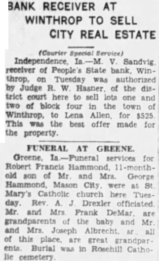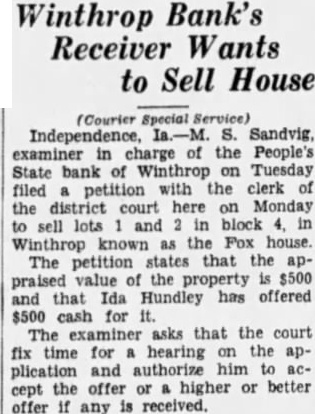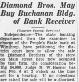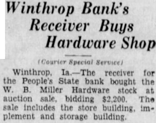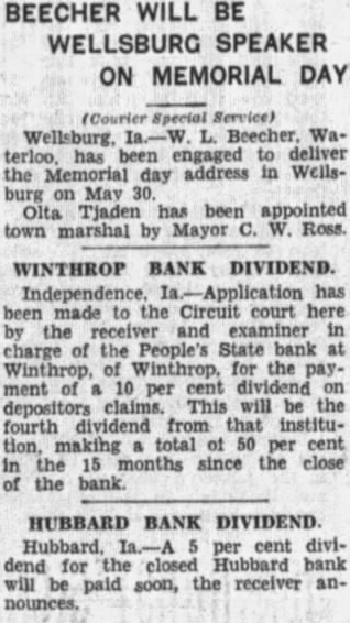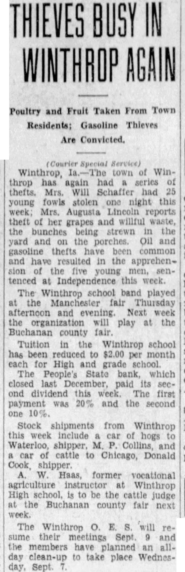 THIEVES BUSY IN WINTHROP AGAIN Poultry and Fruit Taken From Town Residents; Gasoline Thieves Are Convicted. Courier Special Service) Winthrop, town of Winthrop has again had series thefts. Mrs. Will Schaffer had young fowls stolen one night this week; Mrs. Augusta Lincoln reports theft of her grapes and willful waste, the bunches being strewn the yard and on the porches. Oil and gasoline thefts been common and have resulted in the apprehension the five young men, tenced at Independence this week. The Winthrop school band played at the Manchester fair Thursday and evening. Next week the organization will play at the Buchanan county fair. Tuition in the Winthrop school has been reduced to $2.00 per month each for High and grade school. The People's State bank, which closed last December, paid its second dividend this week. The first payment was 20% and the second one 10%. Stock shipments from Winthrop this week include car of hogs to Waterloo, shipper, M. Collins, and car of cattle to Chicago, Donald Cook, shipper. W. Haas, former vocational agriculture instructor at Winthrop High school, is to be the cattle judge at the Buchanan county fair next week. The Winthrop O. E. S. will resume their meetings Sept. and the members have planned an allday clean-up to take place Wednesday, Sept.