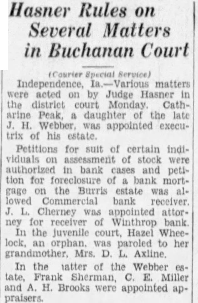 Hasner Rules on Several Matters in Buchanan Court (Courier Special Service) Independence, matters were acted by Judge Hasner in the district court Monday CathPeak, daughter the late Webber, was appointed executrix of his estate. Petitions for suit of certain individuals stock were authorized bank and petition for bank mortgage the Burris estate was Commercial bank Cherney was appointed attorney for receiver of Winthrop bank the juvenile court, Hazel Wheelock, orphan. was paroled to her grandmother. Mrs. Axline In the atter of the Webber esFrank Sherman, E. Miller H. Brooks were appointed appraisers.