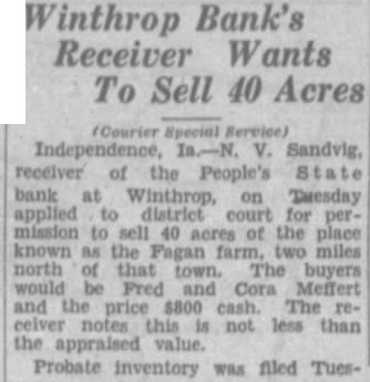 (Courier Special Independence, V. Sandvig, receiver of the bank at Winthrop, on Tuesday applied district for permission to sell 40 acres of the place known as the Fagan two miles north that buyers would be Cora Meffert and the price $800 The notes this less than the appraised value. Probate inventory was Tues-