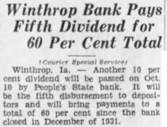 Winthrop Bank Pays Fifth Dividend for 60 Per Cent Total