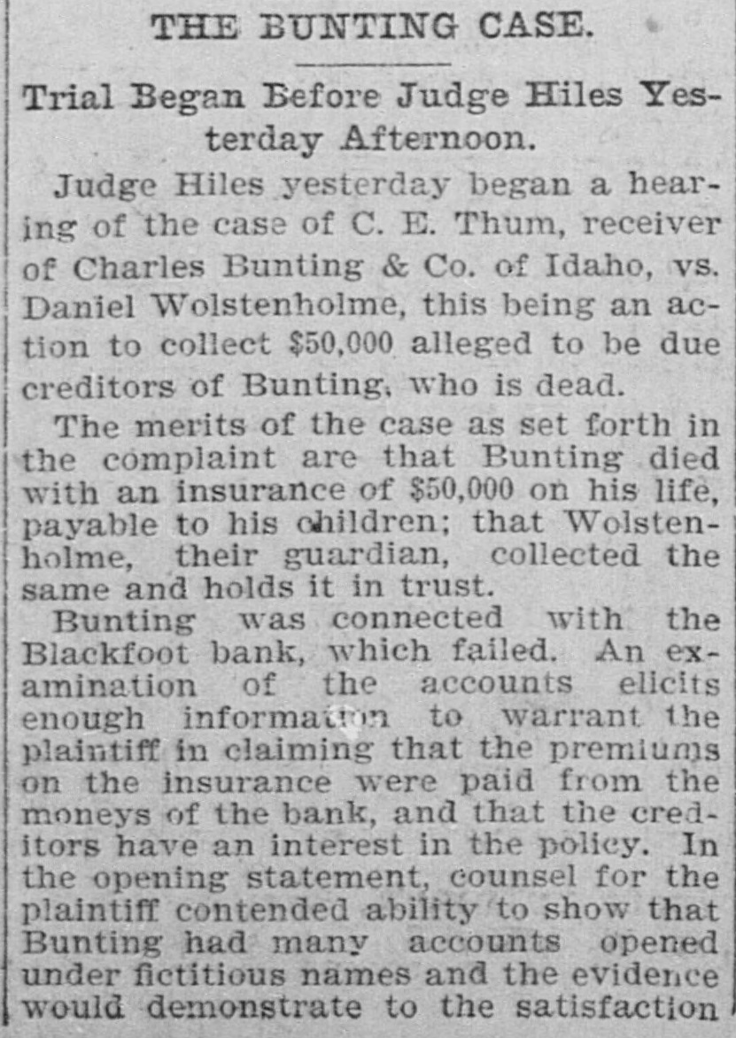 # THE BUNTING CASE. Trial Began Before Judge Hiles Yesterday Afternoon. Judge Hiles yesterday began a hearing of the case of C. E. Thum, receiver of Charles Bunting & Co. of Idaho, vs. Daniel Wolstenholme, this being an action to collect $50,000 alleged to be due creditors of Bunting, who is dead. The merits of the case as set forth in the complaint are that Bunting died with an insurance of $50,000 on his life, payable to his children; that Wolstenholme, their guardian, collected the same and holds it in trust. Bunting was connected with the Blackfoot bank, which failed. An examination of the accounts elicits enough information to warrant the plaintiff in claiming that the premiums on the insurance were paid from the moneys of the bank, and that the creditors have an interest in the policy. In the opening statement, counsel for the plaintiff contended ability to show that Bunting had many accounts opened under fictitious names and the evidence would demonstrate to the satisfaction