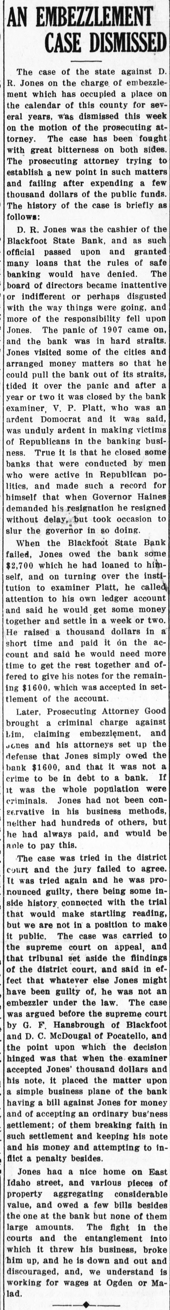AN EMBEZZLEMENT CASE DISMISSED The case of the state against D. R. Jones on the charge of embezzlement which has occupied a place on the calendar of this county for several years, was dismissed this week on the motion of the prosecuting attorney. The case has been fought with great bitterness on both sides. to The prosecuting attorney trying establish a new point in such matters few and failing after expending a thousand dollars of the public funds. The history of the case is briefly as follows: D. R. Jones was the cashier of the Blackfoot State Bank, and as such official passed upon and granted many loans that the rules of safe The banking would have denied. board of directors became inattentive indifferent or perhaps disgusted with or the way things were going, and more of the responsibility fell upon Jones. The panic of 1907 came on, and the bank was in hard straits. Jones visited some of the cities and arranged money matters so that he could pull the bank out of its straits, tided it over the panic and after year or two it was closed by the bank examiner, V. P. Platt, who was an ardent Domocrat and it was said, was unduly ardent in making victims of Republicans in the banking business. True it is that he closed some banks that were conducted by men who were active in Republican for politics, and made such a record himself that when Governor Haines demanded his resignation he resigned to without delay, but took occasion slur the governor in so doing. When the Blackfoot State Bank failed, Jones owed the bank some him$2,700 which he had loaned to self, and on turning over the institution to examiner Platt, he called attention to his own ledger account and said he would get some money together and settle in a week or two. He raised a thousand dollars in short time and paid it on the account and said he would need more time to get the rest together and offered to give his notes for the remain- seting $1600, which was accepted in tlement of the account. Later, Prosecuting Attorney Good brought a criminal charge against Lim, claiming embezzlement, and the Jones and his attorneys set up defense that Jones simply owed the bank $1600, and that it was not If a crime to be in debt to a bank. it was the whole population were criminals. Jones had not been conservative in his business methods, neither had hundreds of others, but he had always paid, and would be aple to pay this. The case was tried in the district court and the jury failed to agree. It was tried again and he was pronounced guilty, there being some inside history connected with the trial that would make startling reading, but we are not in a position to make it public. The case was carried to the supreme court on appeal, and that tribunal set aside the findings of the district court, and said in effect that whatever else Jones might have been guilty of, he was not an embezzler under the law. The case was argued before the supreme court by G. F. Hansbrough of Blackfoot and D. C. McDougal of Pocatello, and the point upon which the decision hinged was that when the examiner accepted Jones' thousand dollars and his note, it placed the matter upon a simple business plane of the bank having a bill against Jones for money and of accepting an ordinary bus'ness settlement; of them breaking faith in such settlement and keeping his note and his money and attempting to inflict a penalty besides. Jones haa a nice home on East Idaho street, and various pieces of property aggregating considerable value, and owed a few bills besides the one at the bank but none of them large amounts. The fight in the courts and the entanglement into which it threw his business, broke him up, and he is down and out and discouraged, and, we understand is working for wages at Ogden or Malad.
