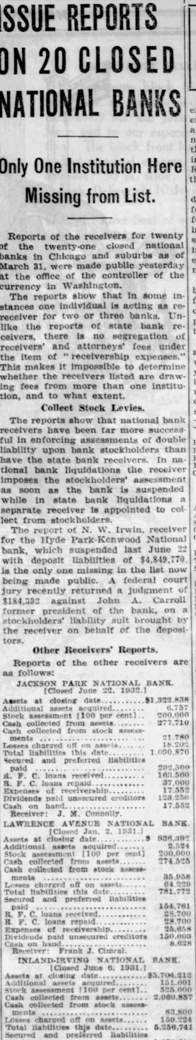 ISSUE REPORTS ON 20 CLOSED NATIONAL BANKS Only One Institution Here Missing from List. Reports of the receivers for twenty of the closed national banks in Chicago and suburbs as of March 31, were made public at the office of the controller of the currency in The show that in reports stances one individual acting as receiver for two or Un like the reports of ceivers, there segregation of receivers' and attorneys' fees under the item of This makes it to whether the receivers listed are ing fees from more than one tion, and to what extent. Collect Stock Levies. The reports show that bank have been far more ful in of liability upon bank the state bank In tional bank the imposes the as soon as the bank while in state bank separate is appointed to col lect from The report for the bank, which last with deposit is the only one missing in the jury brought the behalf the tors. Other Receivers' Reports. Reports of the other receivers are R 000 JACKSON PARK assets per from assets charged Expenses LA ments charged paid loans repaid Assets 000 Cash Losses thjs