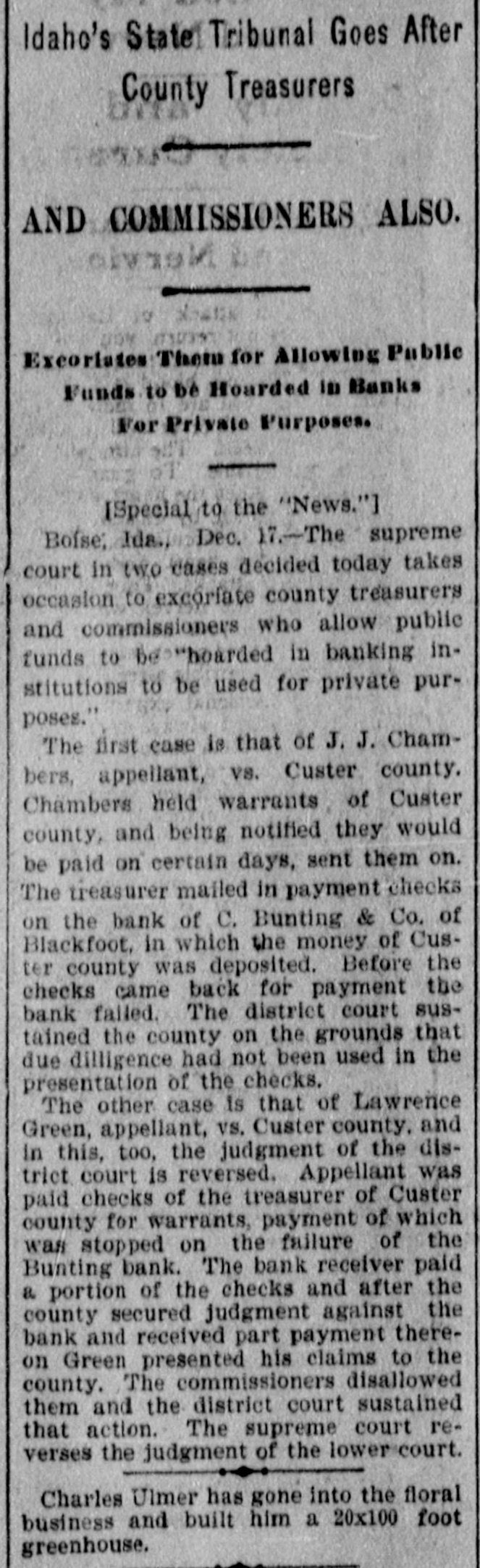Idaho's State Tribunal Goes After County Treasurers AND COMMISSIONERS ALSO. Excoriates Them for Allowing Public Funds to be Hoarded in Banks For Private Purposes. [Special to the "News."] Boise: Ida., Dec. 17.-The supreme court in two cases decided today takes occasion to excorfate county treasurers and commissioners who allow public funds to be "hoarded in banking institutions to be used for private purposes.' The first case is that of J. J. Chambers, appellant, vs. Custer county. Chambers held warrants of Custer county, and being notified they would be paid on certain days, sent them on. The treasurer mailed in payment checks on the bank of C. Bunting & Co. of Blackfoot, in which the money of Custer county was deposited. Before the checks came back for payment the bank failed. The district court sustained the county on the grounds that due dilligence had not been used in the presentation of the checks. The other case is that of Lawrence Green, appellant, vs. Custer county. and in this, too, the judgment of the district court is reversed. Appellant was paid checks of the treasurer of Custer county for warrants, payment of which was stopped on the failure of the Bunting bank. The bank receiver paid a portion of the checks and after the county secured judgment against the bank and received part payment thereon Green presented his claims to the county. The commissioners disallowed them and the district court sustained that action. The supreme court reverses the judgment of the lower court. Charles Ulmer has gone into the floral business and built him a 20x100 foot greenhouse.