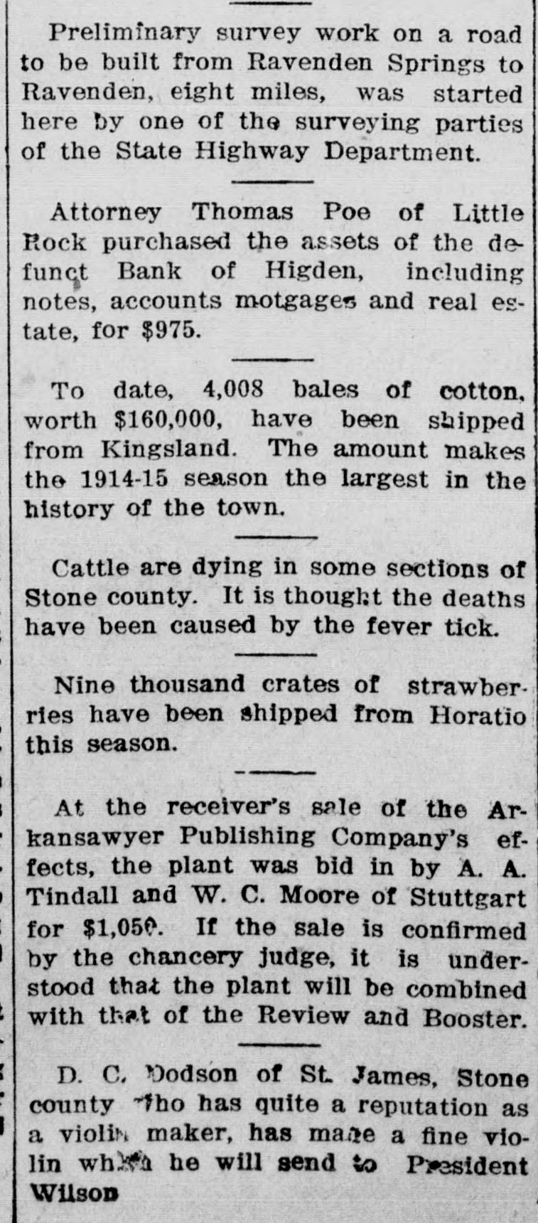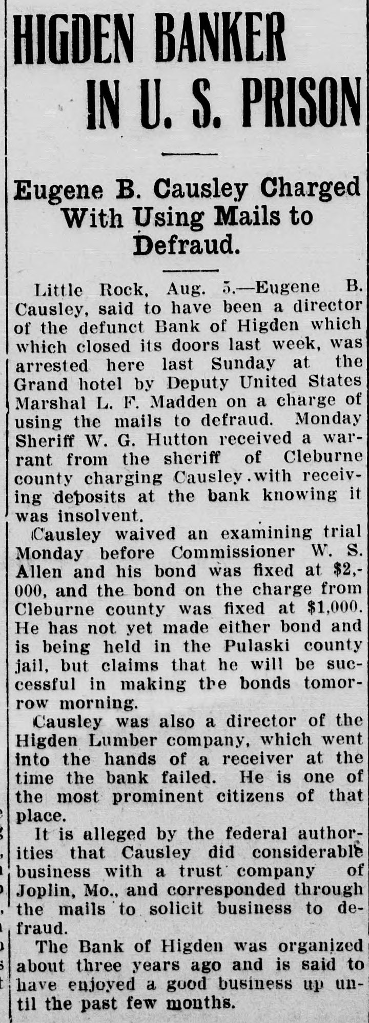 HIGDEN BANKER IN U. S. PRISON Eugene B. Causley Charged With Using Mails to Defraud. Little Rock, Aug. 5.-Eugene B. Causley, said to have been a director of the defunct Bank of Higden which which closed its doors last week, was arrested here last Sunday at the Grand hotel by Deputy United States Marshal L. F. Madden on a charge of using the mails to defraud. Monday Sheriff W. G. Hutton received a warrant from the sheriff of Cleburne county charging Causley . with receiving deposits at the bank knowing it was insolvent. Causley waived an examining trial Monday before Commissioner W. S. Allen and his bond was fixed at $2,000, and the bond on the charge from Cleburne county was fixed at $1,000. He has not yet made either bond and is being held in the Pulaski county jail, but claims that he will be successful in making the bonds tomorrow morning. Causley was also a director of the Higden Lumber company, which went into the hands of a receiver at the time the bank failed. He is one of the most prominent citizens of that place. It is alleged by the federal authorities that Causley did considerable business with a trust company of Joplin, Mo., and corresponded through the mails to solicit business to defraud. The Bank of Higden was organized about three years ago and is said to have enjoyed a good business up until the past few months.
